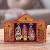 This colorful box depicts the first Christmas. Alejandro Chávez crafts a traditional retablo (diorama) in the regional style of Ayacucho. The Holy Family and the three kings are modeled of clay and painted by hand. Beneath them, villagers harvest the red fruit of the prickly pear cactus.