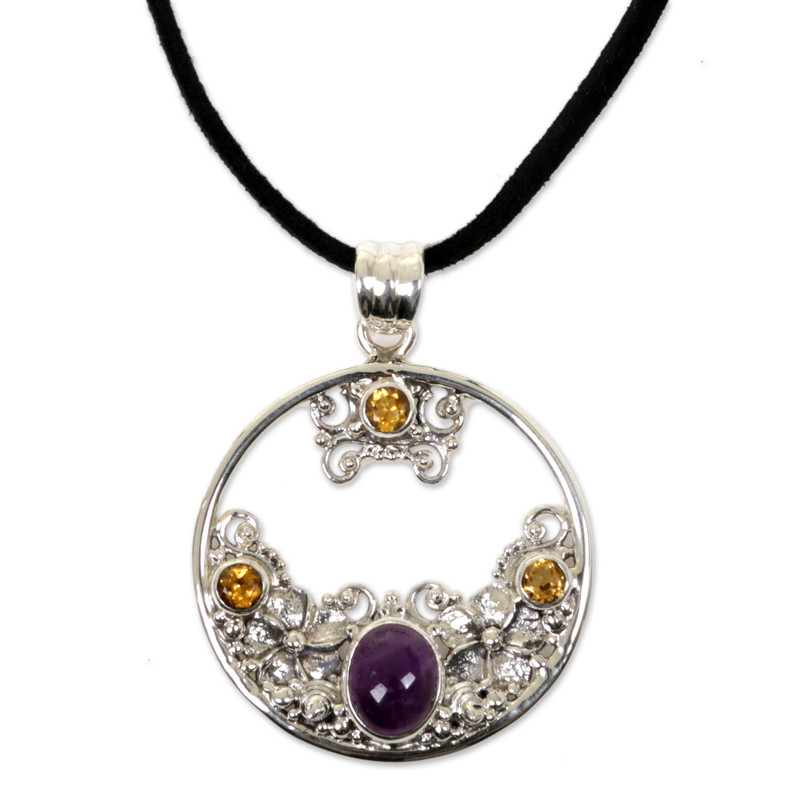 Caught under the spell of the harvest moon, glistening gemstones caress frangipanis in the romantic design of this necklace. In Buana's design, the sterling silver medallion is crafted by hand with faceted citrine and an amethyst cabochon. The highly detailed pendant is worn on a dark brown faux suede cord.