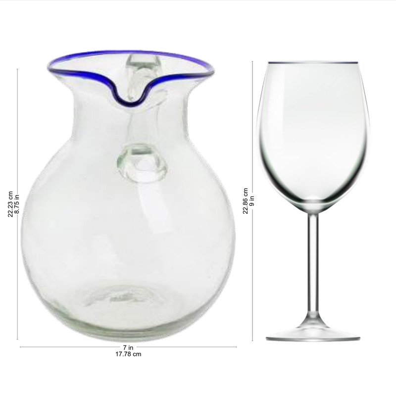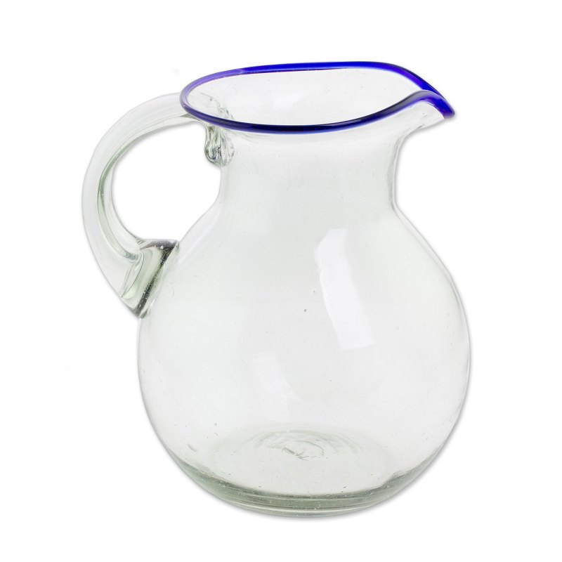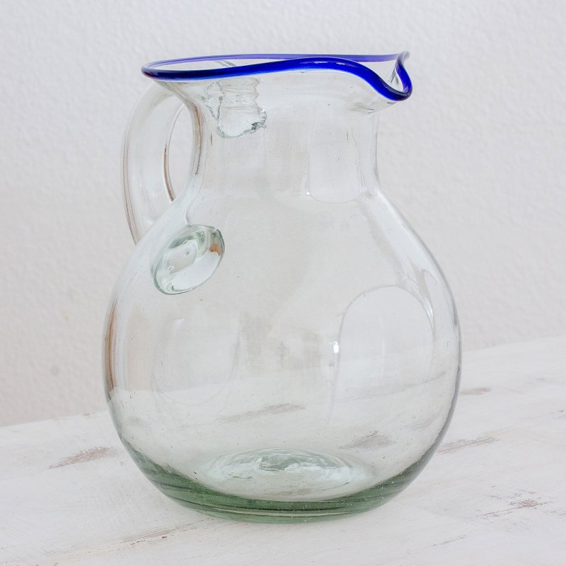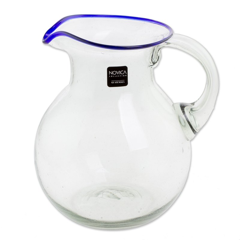 Delivery EstimateSimple is beautiful in this clear, blue-rimmed, hand blown pitcher. The Cantel Blown Glass Artisans of Guatemala handcraft this pitcher using glass salvaged from industrial and individual sources.