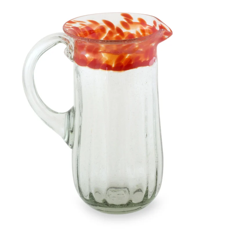 Delivery Estimate"This pitcher is from our new collection. We designed it with an eye-catching orange rim," Cantel Blown Glass Artisans explain. They craft the pitcher by hand, using traditional blown glass techniques while executing this innovative design.