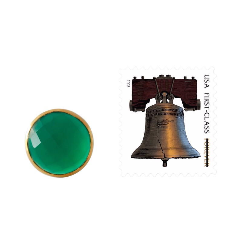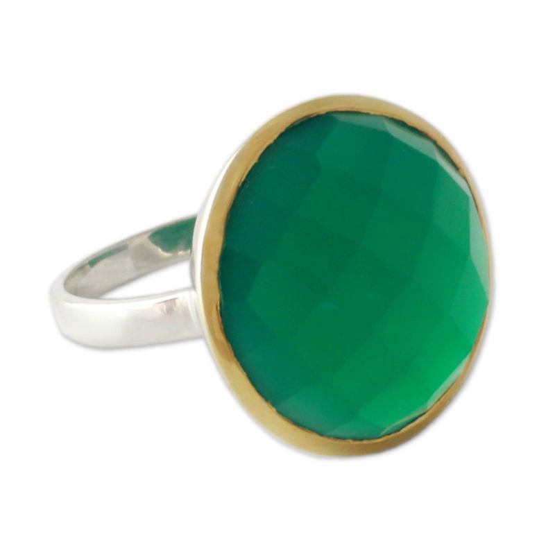 Richly colored enhanced green onyx, with its verdant allure, crowns this dramatic cocktail ring from Mahavir in India. The 7.5 carat checkerboard-cut stone is set in sterling silver, with a halo of gleaming 18k gold plate. A slender polished silver band completes the design.