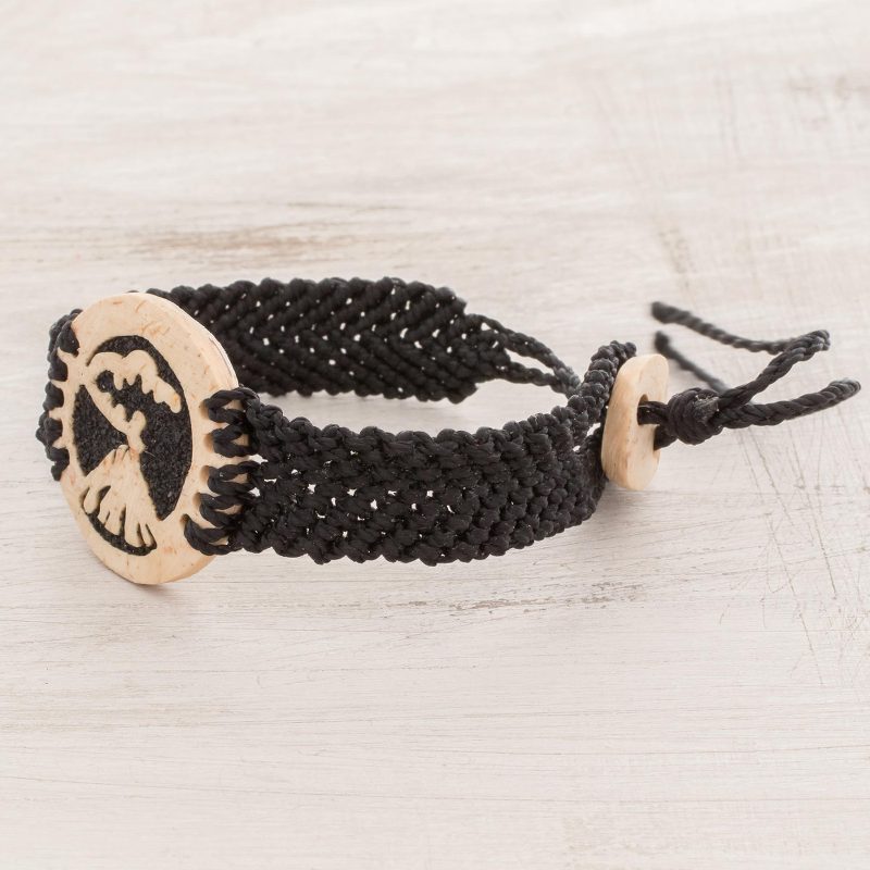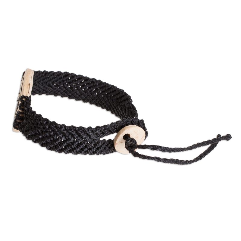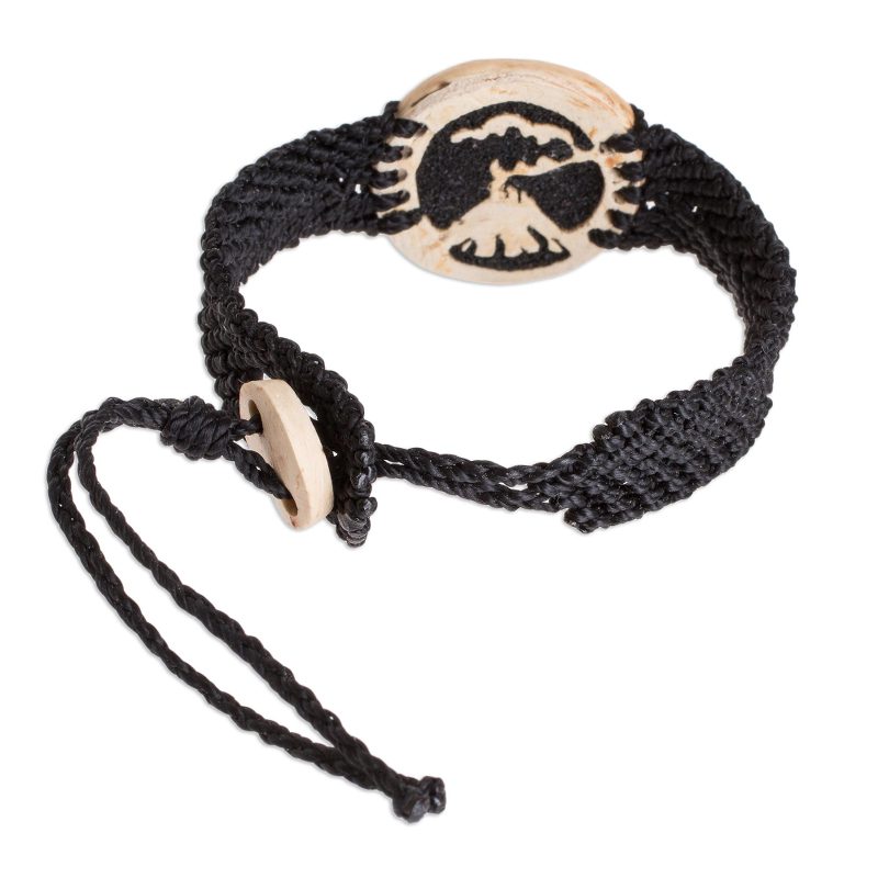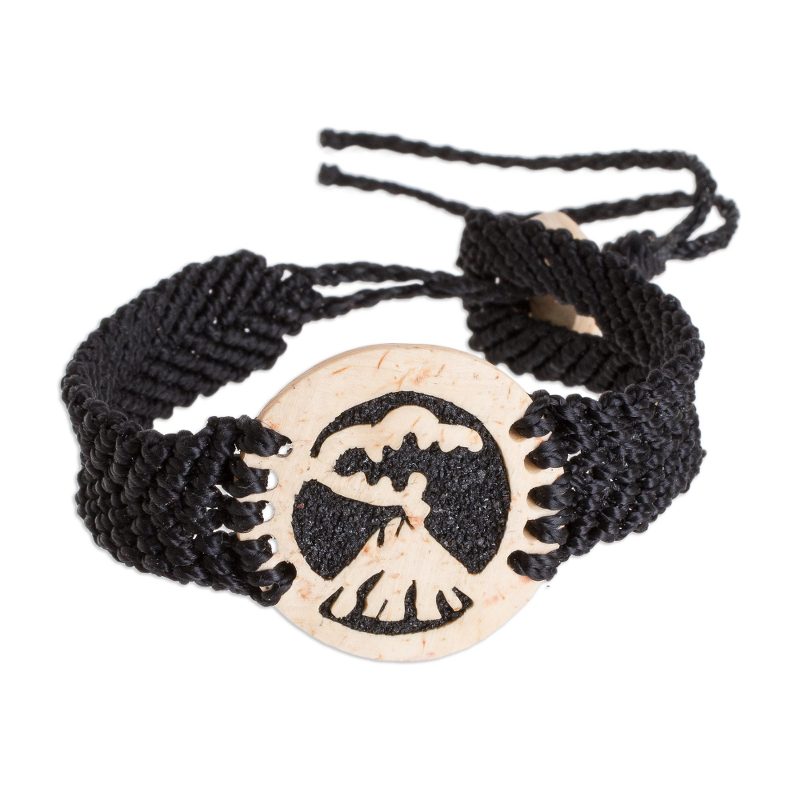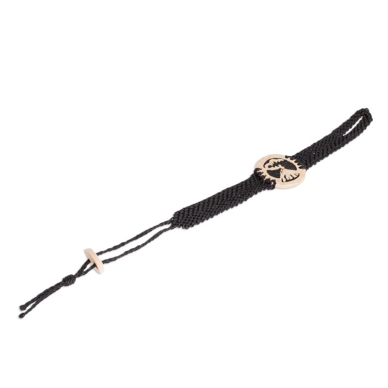 Depicting a fiery volcano on the verge of eruption, the pendant of this bracelet is hand-carved from natural coconut shell. The negative space is then filled with dark lava stone and resin. Guatemalan artisans Fernando and David create this bracelet, which is crafted with an adjustable wristband of black nylon macrame.