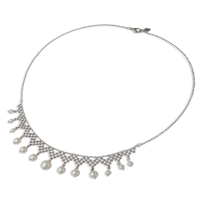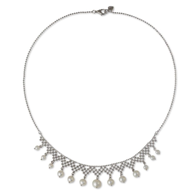 This beautifully feminine necklace is crafted by Thai artisan Angels. She creates a lace-like woven pendant from sterling silver ball chain, and suspends cultured white pearls in graduated sizes from the bottom. The result is elegance itself.