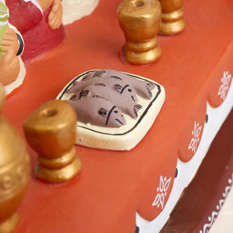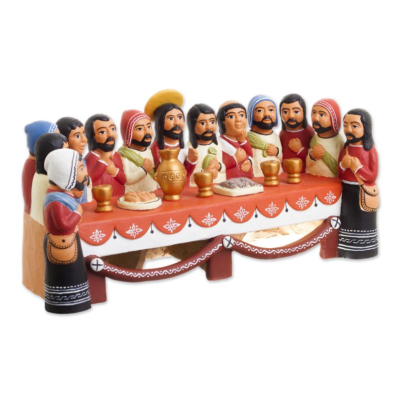 Working in ceramic, Dionisio Rojas depicts The Last Supper, an event of great religious significance. Jesus is joined by his twelve apostles, all dressed in traditional Andean attire. From this symbolic moment comes the breaking of bread and sharing of wine that marks the Holy Eucharist.