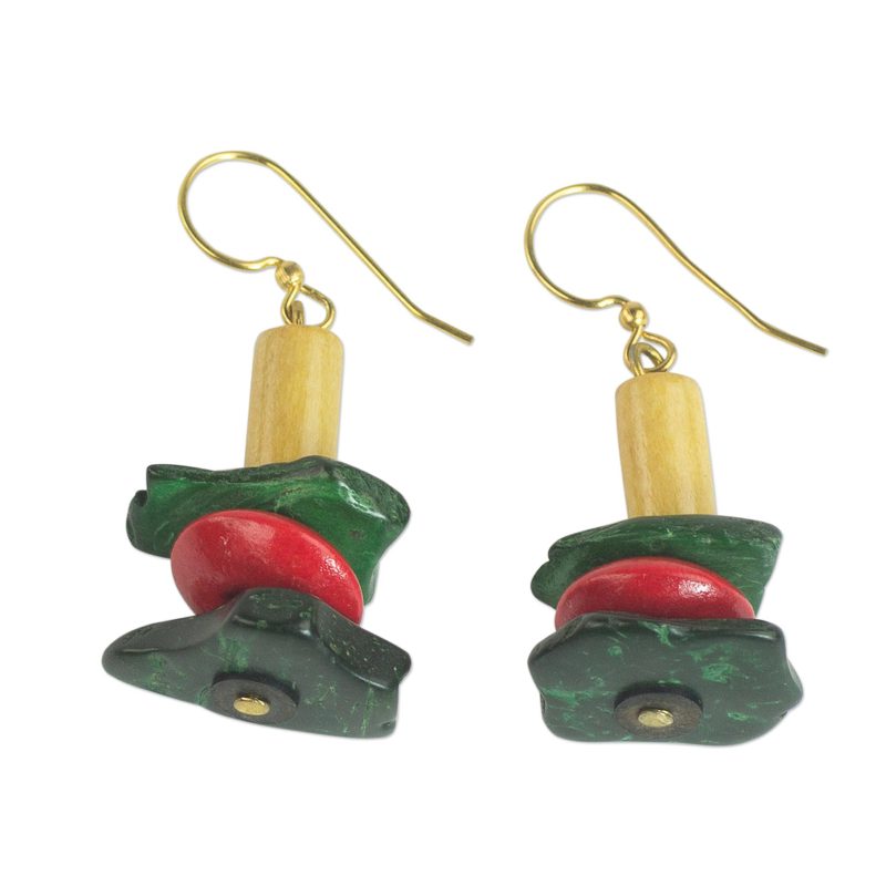Colors of red and green characterize this pair of dangle earrings from Ghana. Crafted by hand with beads of sese wood, coconut shell, and recycled plastic, these inspiring earrings feature an original design by Catherine Offei Kwapong. Hanging on brass hooks, the earrings are inspired by prosperous thoughts.