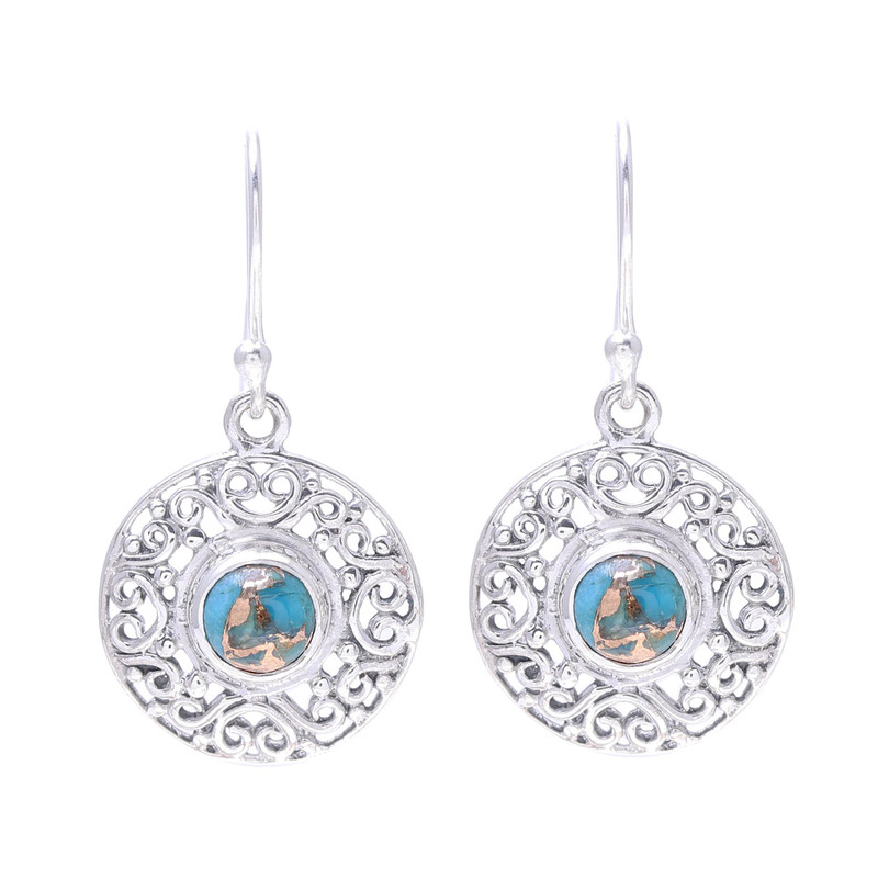 Shanker of India designs handcrafted dangle earrings reminiscent of a drop of the brilliant blue sea surrounded by the froth of a cresting wave. In these earrings, a round cabochon of composite turquoise is ringed with delicate sterling silver scrollwork.