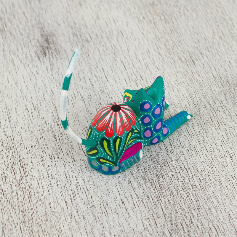 A playful, excited cat makes a vibrant and fun addition to any home, handcrafted from copal wood and maguey plant fibers in the style of traditional alebrijes. Mexican couple Zeny and Reyna proudly paint this sculpture by hand, drawing inspiration from their cultural roots to cover the cat in bright floral motifs against a teal body. Small parts are separated for shipping to protect from breakage.
