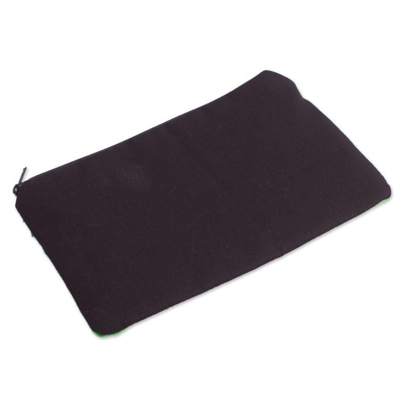 A scarlet macaw flies through the azure sky, greeting his jungle neighbors. A yellow giraffe and a blue elephant enjoy the verdant landscape. By Balvina Huaytalla, this handcrafted cosmetic bag showcases the traditional Andean art of arpillería. Each tiny figure is crafted in three dimensions and embroidered by hand. The reverse side is solid black cotton.