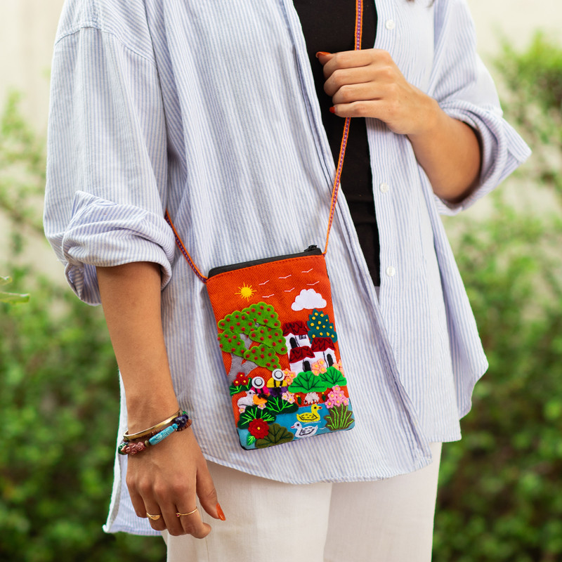 Crafted by hand from a cotton blend in the style of traditional arpillera patchwork, a lovely Andean scene depicts a village at sunset on the surface of this cell phone case. Peruvian artisan Maria Ramos Sanchez creates this beautiful case, featuring a tangerine sky on the front and a black back. It opens with a zipper to a lined interior for keeping your electronics safe.