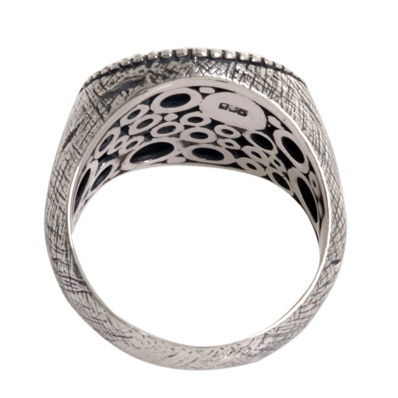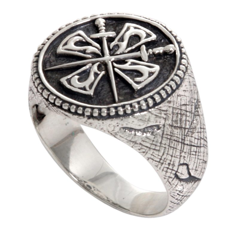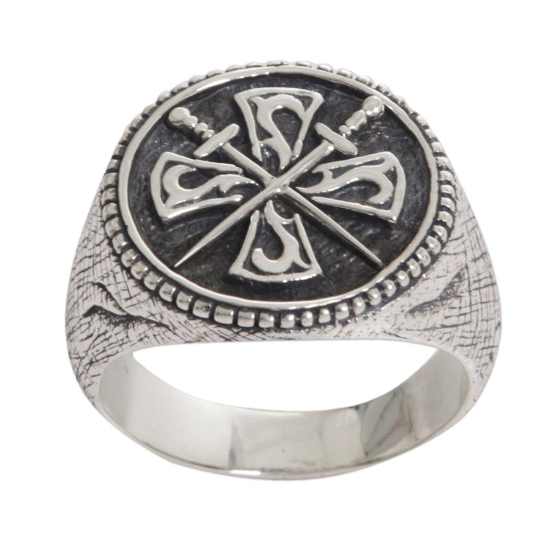 Indonesia's Putu Gede Darmawan designs this men's signet ring with the image of a cross with two swords in front of it. The swords are representative of Indra, known as a god of war and a protector according to Hindu traditions.