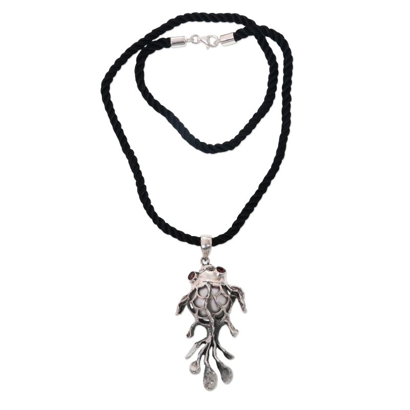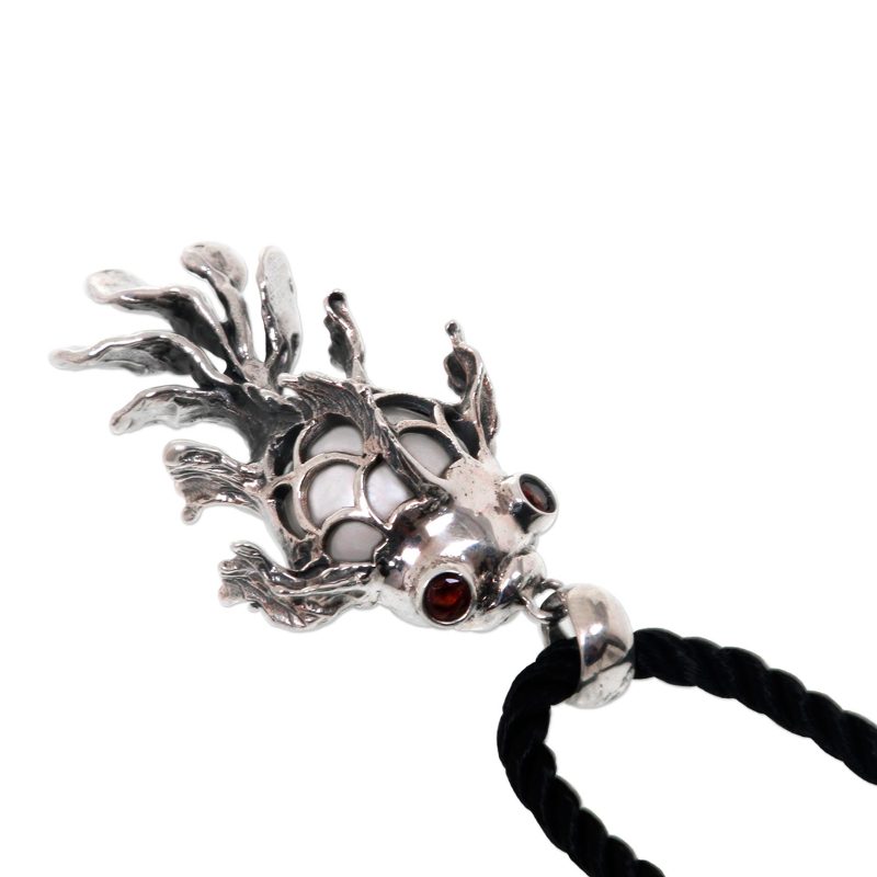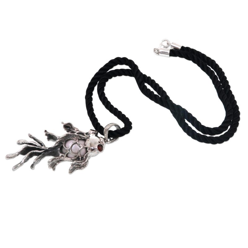 Beautiful in its grace, a sterling silver goldfish dances on a black silk cord in this necklace by Rosalia Tarigan. The body encloses an iridescent cultured mabe pearl and red garnets depict the eyes.
