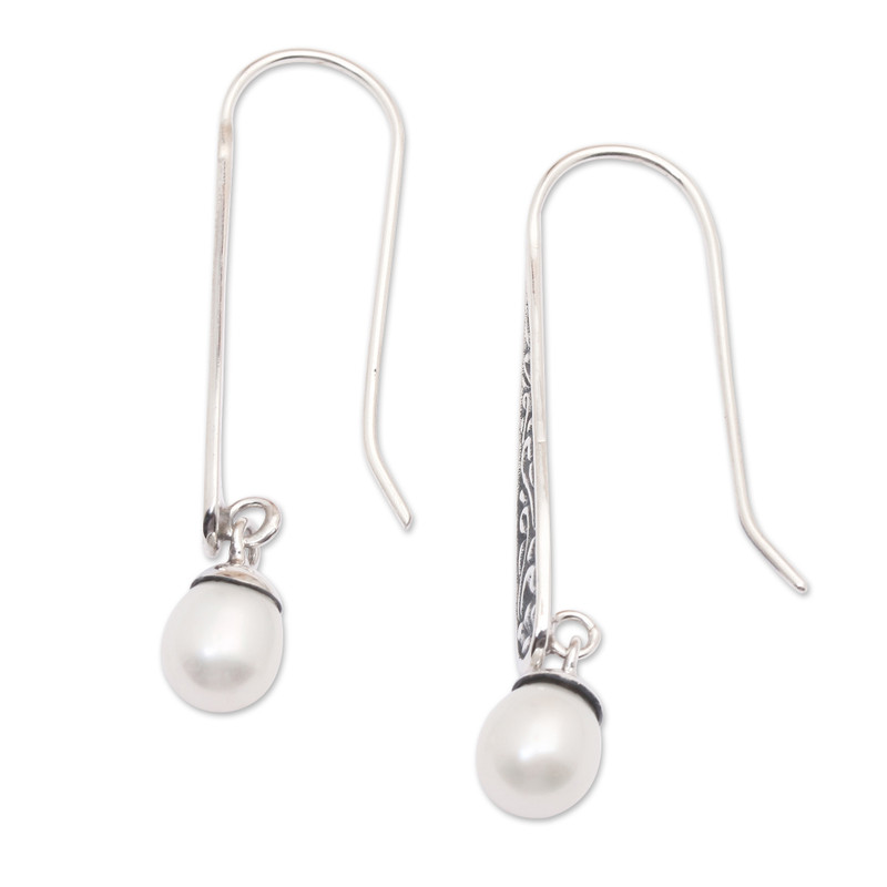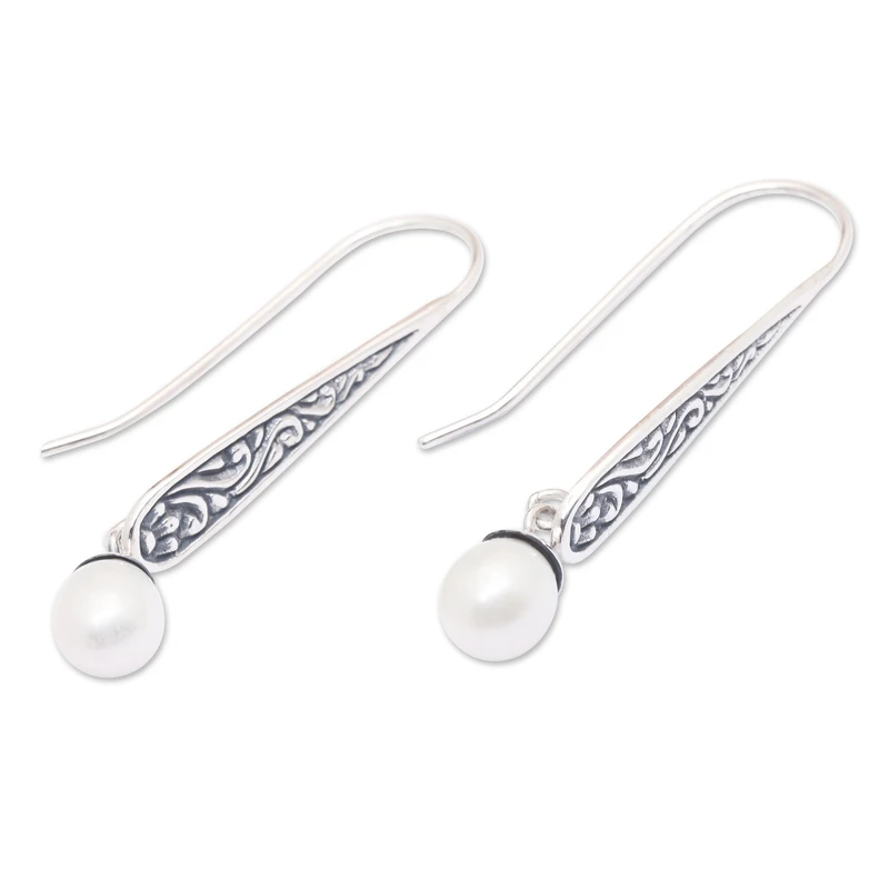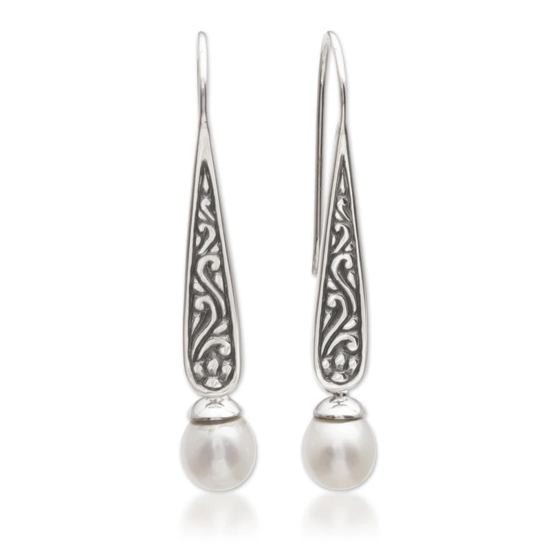 These sophisticated earrings are a beautiful blend of Bali's artistry and nature's elegance. Handcrafted from sterling silver into graceful drop shapes, each piece is adorned with intricate spiral motifs. Suspended below are luminous cultured freshwater pearls, forming a testament to the island's rich jewelry-making heritage – a perfect balance of traditional craftsmanship and timeless beauty.