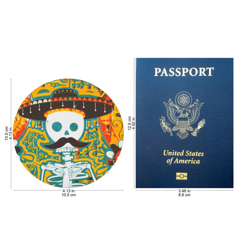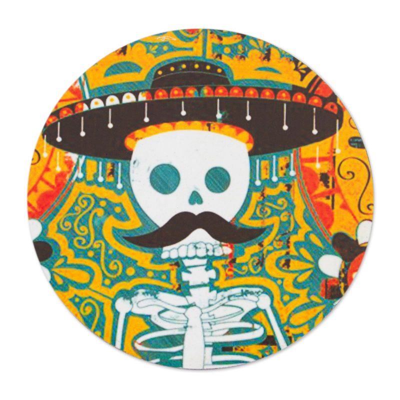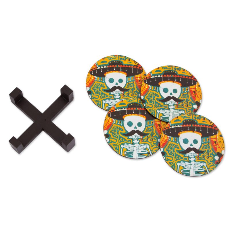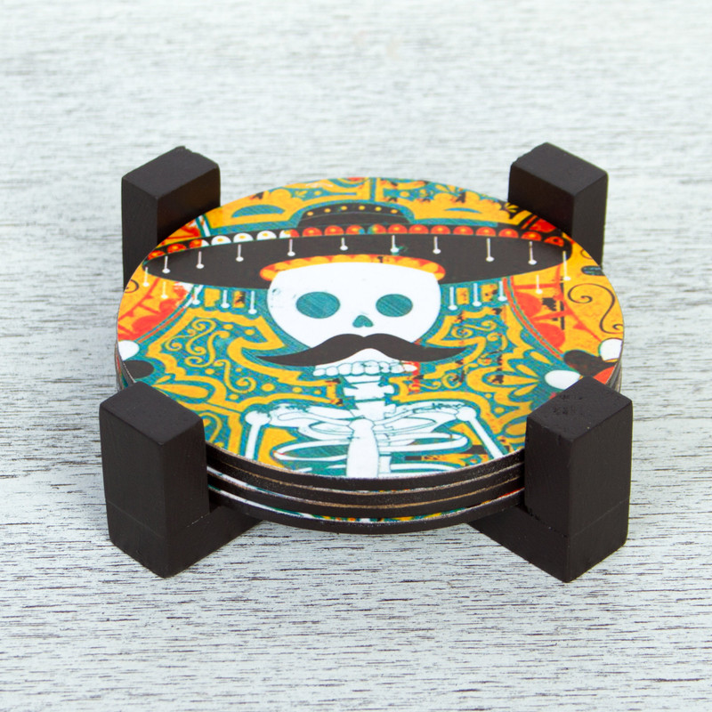 A dapper Catrin with a hat and mustache is featured in this set of four round coasters, made of pinewood with decoupage cutouts. Crafted by Mexico's Ana Maria Gonzalez, these coasters celebrate the beauty of Day of the Dead imagery. Includes a dark brown holder.