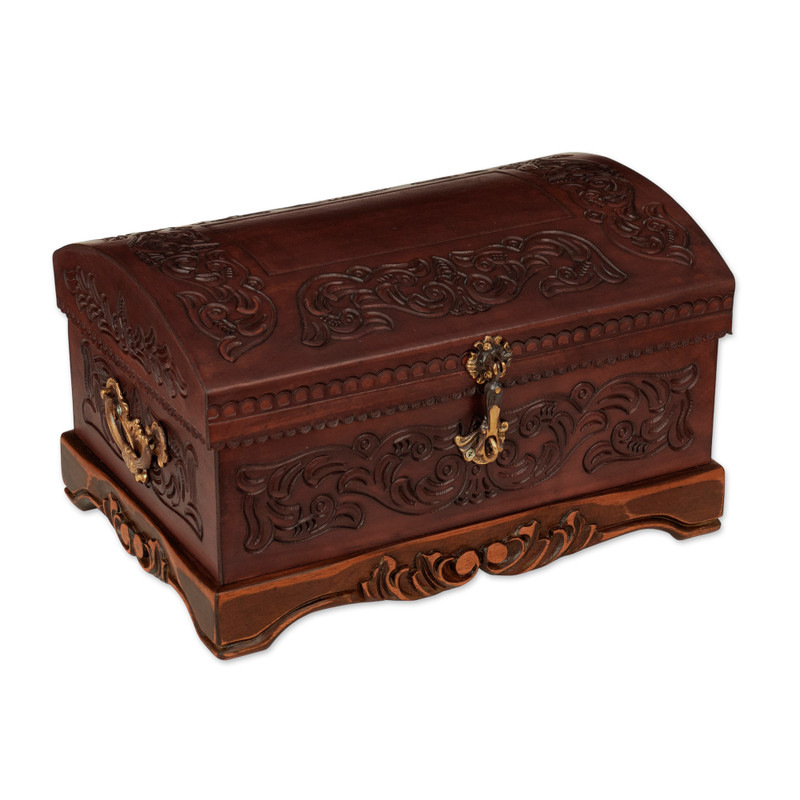 Backed by our 100% Happiness GuaranteeCrafted by hand, this jewelry box by Julio Sanchez is a superb example of a traditional Peruvian art. He works in mohena wood, a fine hardwood whose grain is similar to mahogany. Beautifully tooled leather depicts colonial garlands, and the chest has ornate bronze handles on each side.