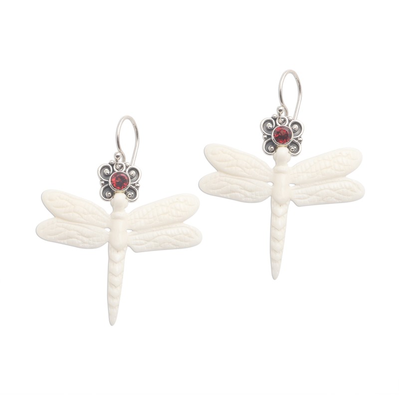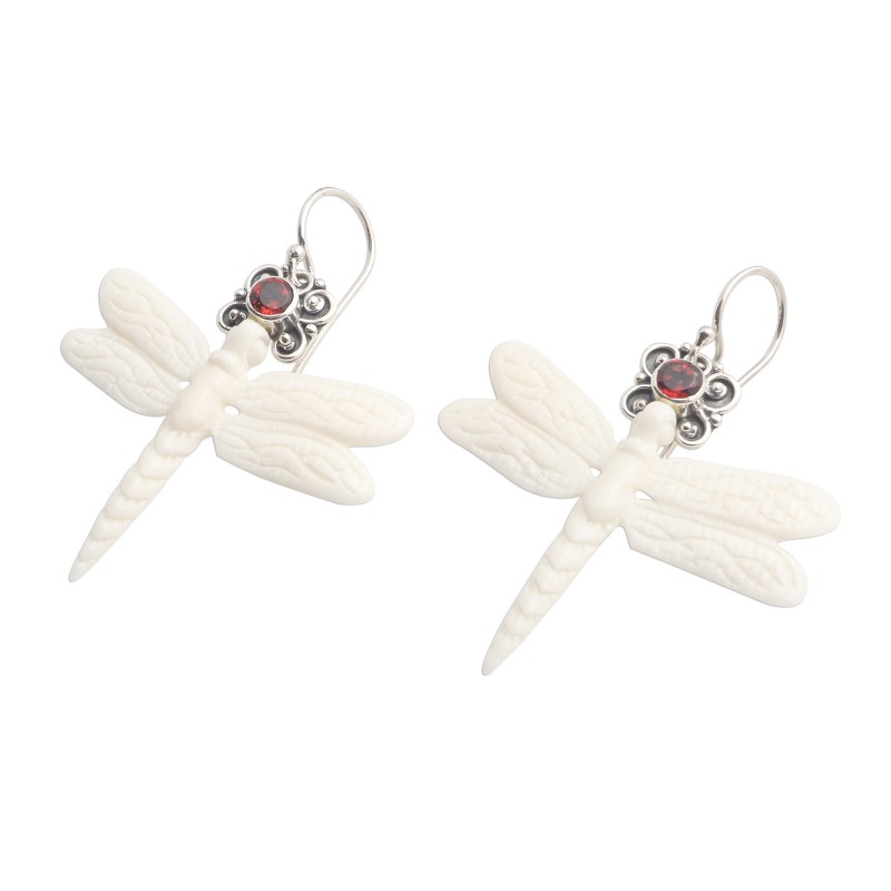 Crafted of sterling silver, these beautiful earrings are designed by Bali's Made Wardika. Sleek dragonflies are carved by hand from smooth, white bone. The winged creatures are crowned by faceted round garnets in silver bezels.