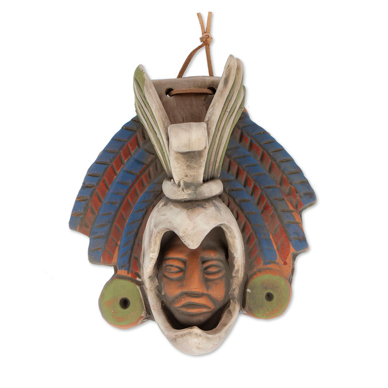 Inspired by the noble elite warriors of the ancient Aztecs, artisans from the Angel Cerón Artisan Association handcraft a ceramic mask of a noble eagle warrior. The warrior's face is framed with the red and blue feathers that cascade down from the headdress shaped like a stylized eagle. The mask can be hung on a wall with the sueded leather cord loop attached to the top of the headdress.