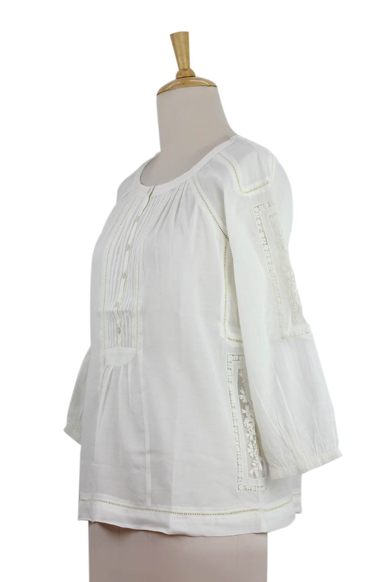 It's all about the details in this magnificently feminine blouse from India's Neha Sharma. Crafted from a cotton/viscose blend in soft ecru, the top features a rounded neckline and a pintucked placket with 6 buttons. Dainty hemstitch embroidery accents the blouse, as well as panels of exquisite floral lace on the sleeves and sides.