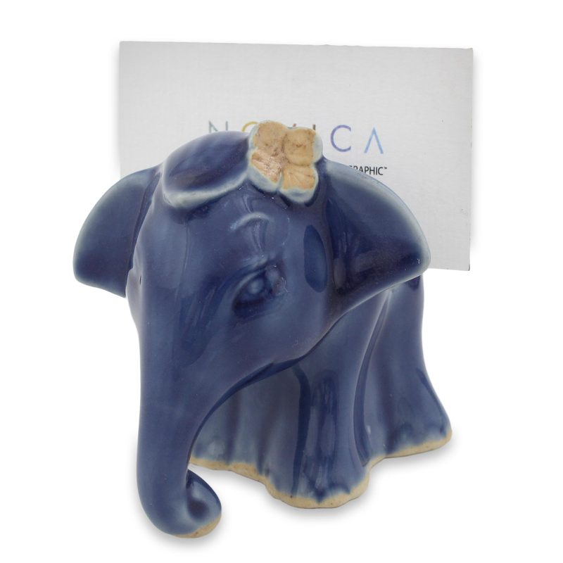 Shaped of ceramic, this cheerful elephant holds business cards with style. Duangkamol works in the painstaking celadon technique, creating a beautiful symbol of old Siam. It is glazed in a richly crackled blue.