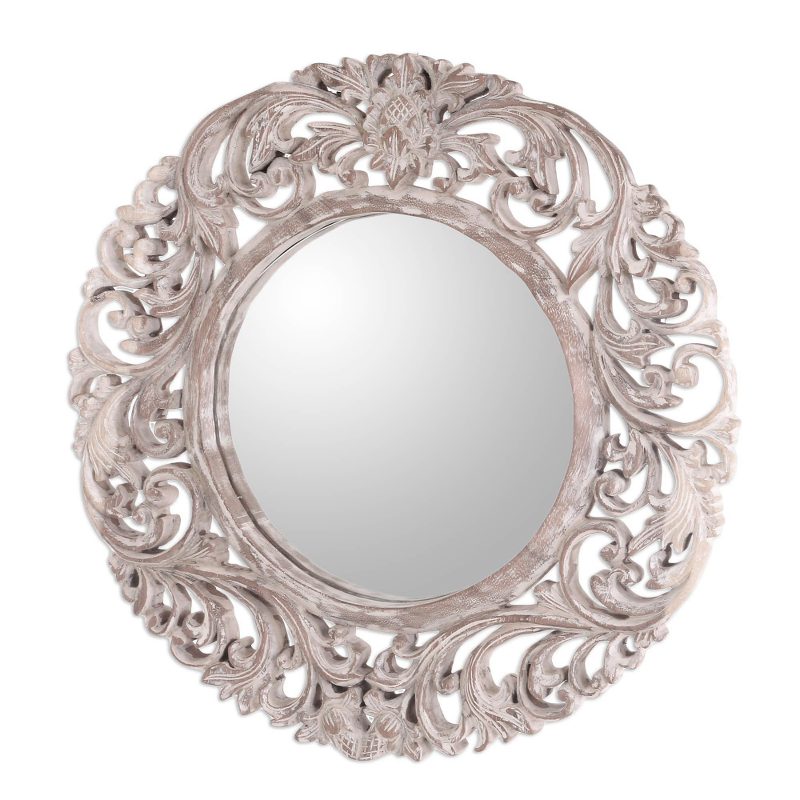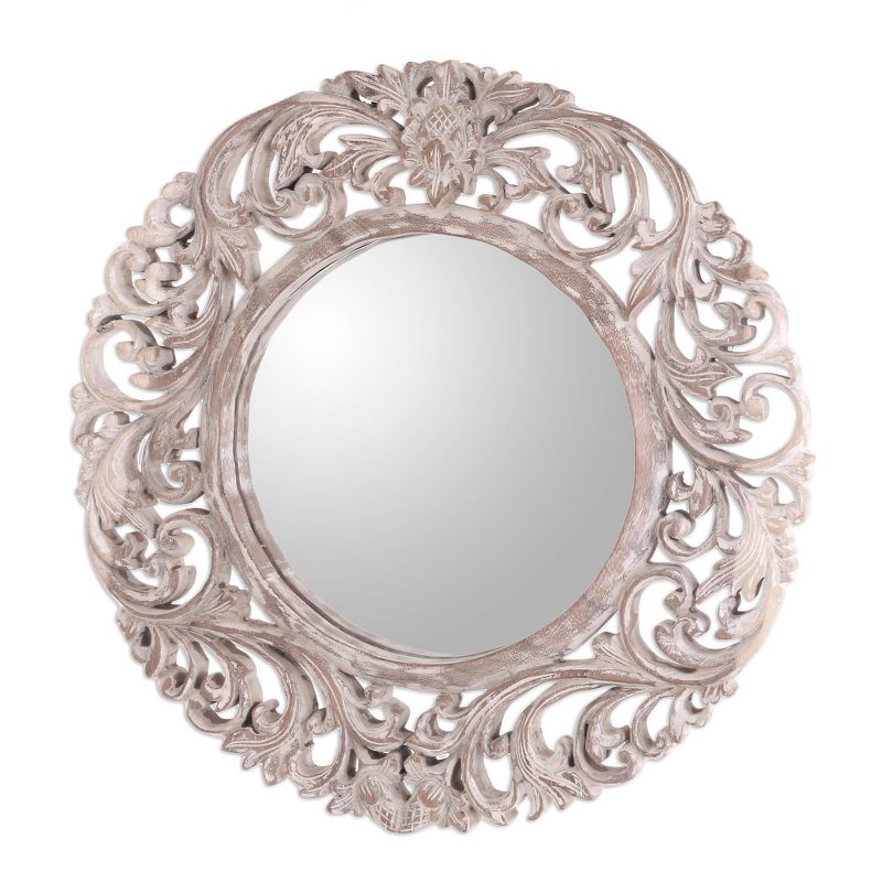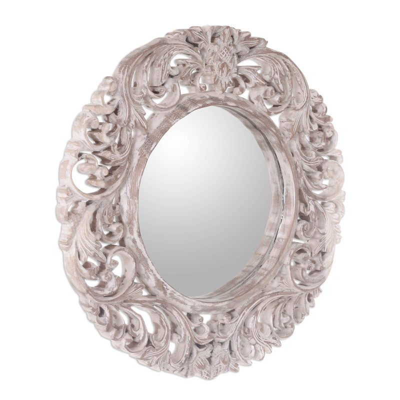 Bring an element of a vibrant Balinese garden into your home with this distressed whitewash wood mirror. The mirror's frame, handmade by artisan Sarwaedi of Bali, features engraved floral buds in stunning detail. The symmetry of the round mirror adds to the feeling of serenity evoked by this wall decor.