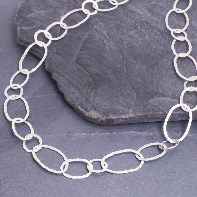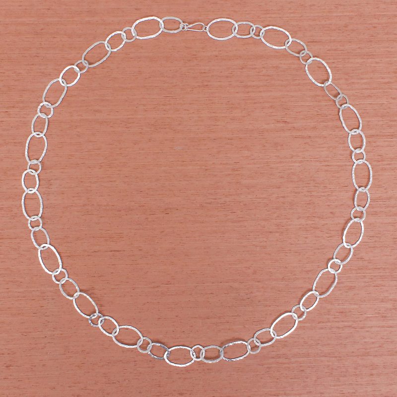 Backed by our 100% Happiness GuaranteeWorking with Karen hill tribe silver artisans, Pakaon Sojintarit presents this stylish contemporary link necklace that is sure to become one of your favorite accessories. The extra-long necklace features hammered 950 silver oval links in various sizes. Wear it long, or double it over for a different look. The necklace is secured by a sterling silver hook clasp.