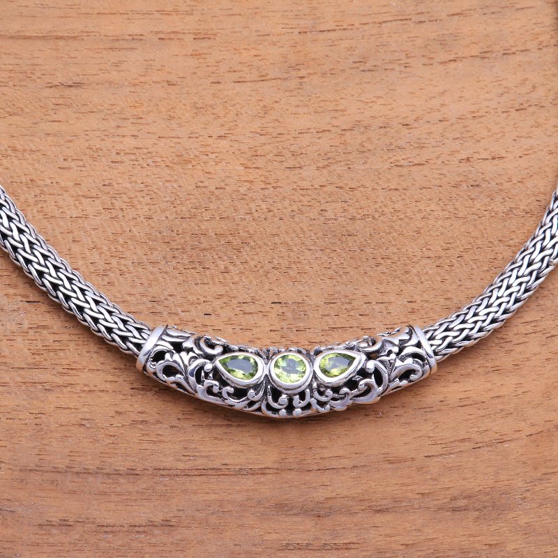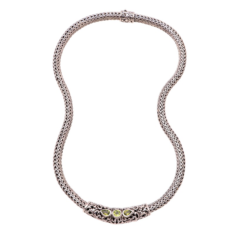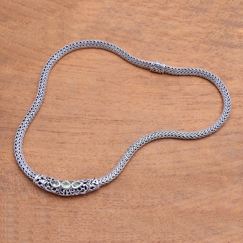 Fit for a warrior queen, this necklace is created by Nyoman Ariawan in Bali. He chooses sterling silver foxtail chain to circle the neck, centered by an intricate sterling pendant with three faceted peridot gemstones.