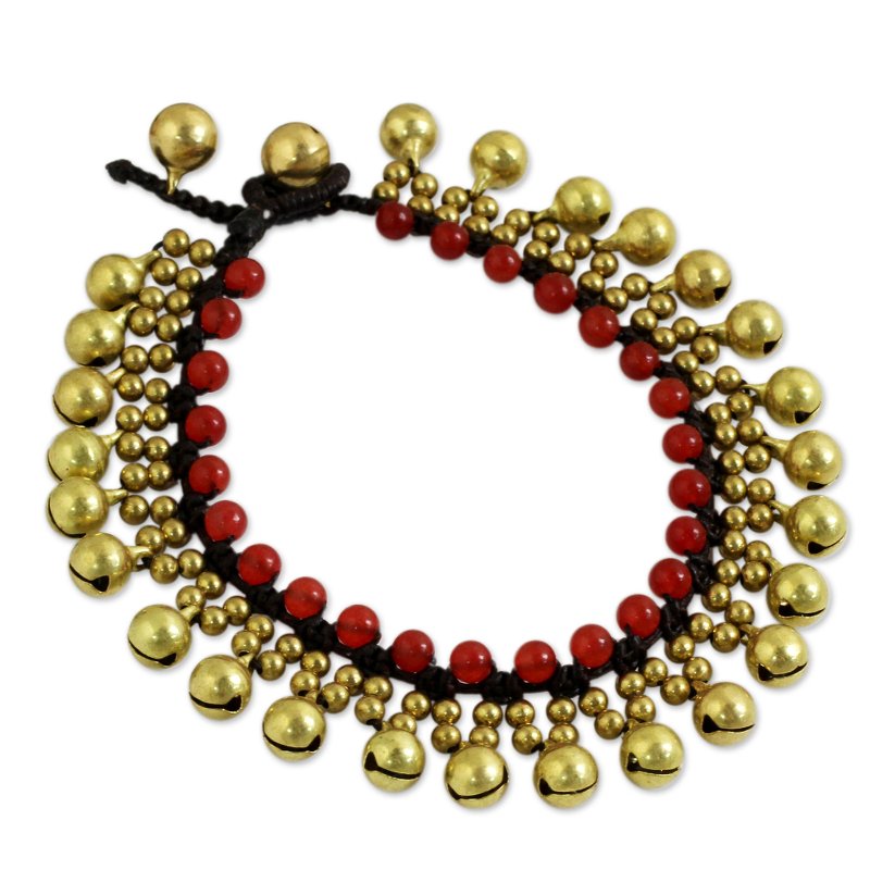 Joyful chimes are ringing, heralding the arrival of summer. Tiraphan Hasub of Thailand presents this original bracelet design, featuring cherry-red dyed quartz on braided brown cords. Two rows of tiny brass beads lead to round brass bells that jingle cheerfully. The bracelet closes at one of two lengths with another brass bell.