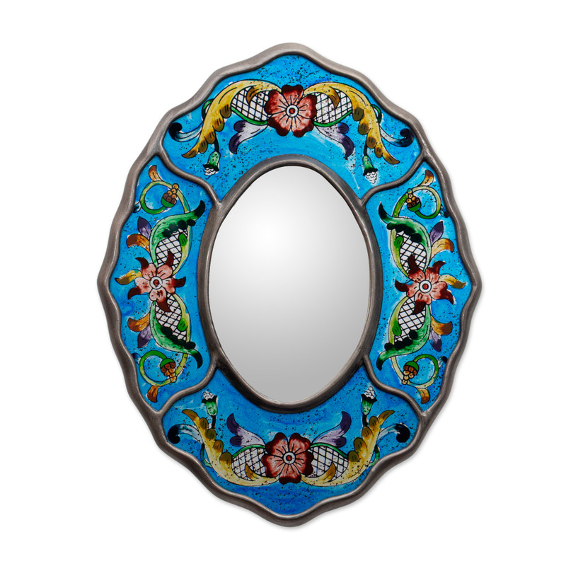 You can find our reverse painted glass mirror 'Blue Colonial Wreath' by Asunta Pelaez in wall decor categories such as Reverse Painted Glass Mirrors, Floral Mirrors, Colonial Mirrors, Glass Mirrors and Wood Mirrors. Enjoy exploring these sections for other Novica treasures.