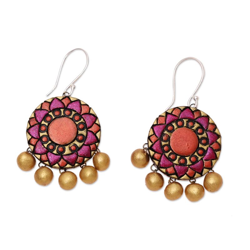 Handcrafted from sterling silver, two circles display hand-painted mandala motifs in hues of red and orange. Ritu Thapar designs these Indian earrings, which feature gleaming gold-tone baubles that dangle below. Each earring swings from a hook of sterling silver.