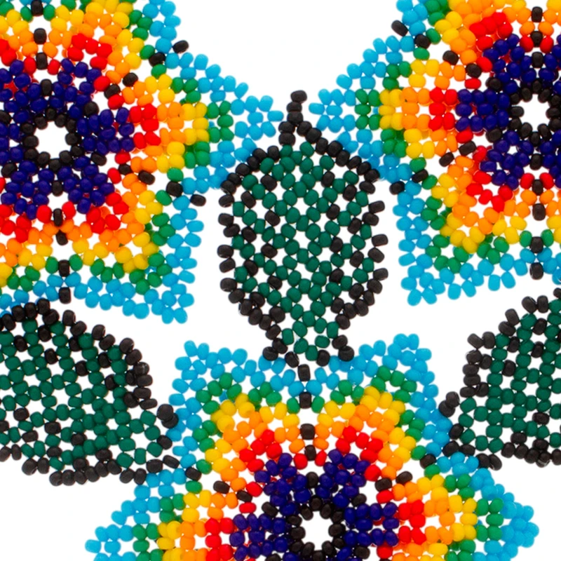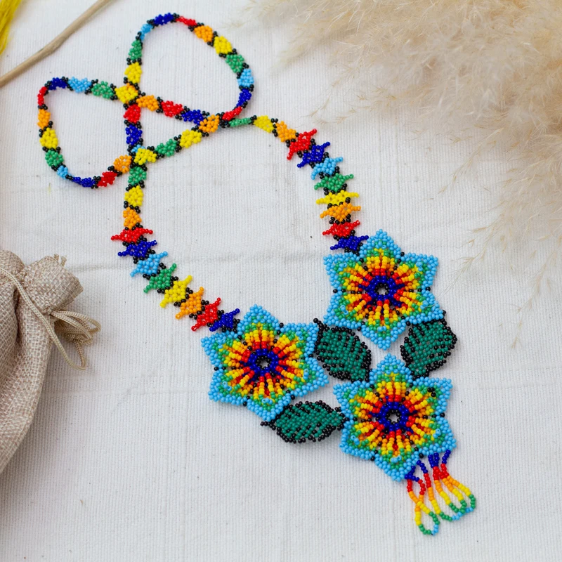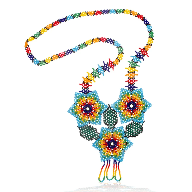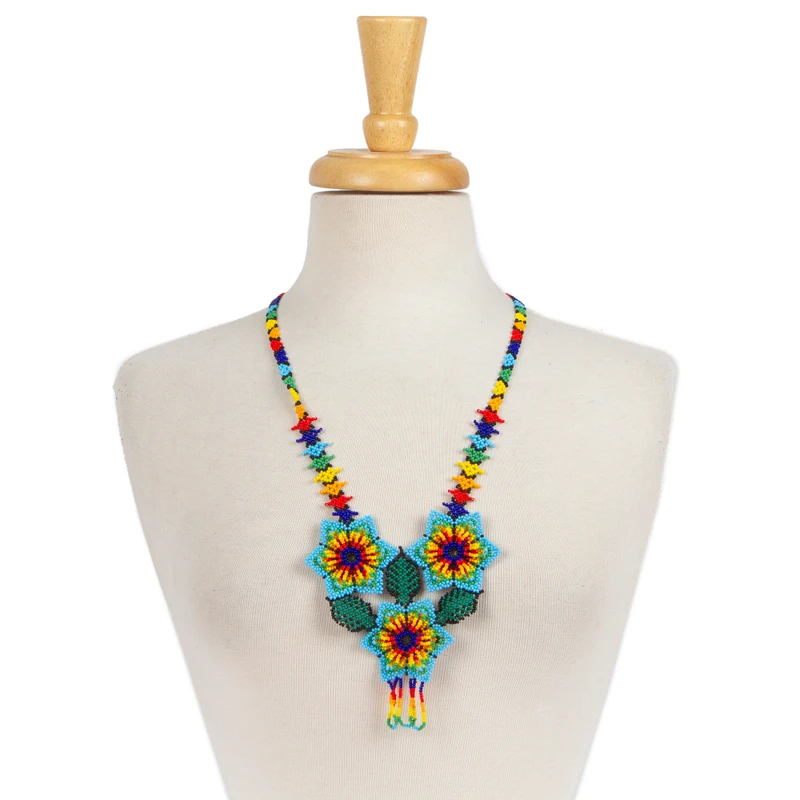 Mexican artisan Adriana Trejo works in the traditional style of Huichol artistry to design this pendant necklace. A trio of lovely flowers is handcrafted of petite glass beads, centering a rainbow strand that circles the neck.