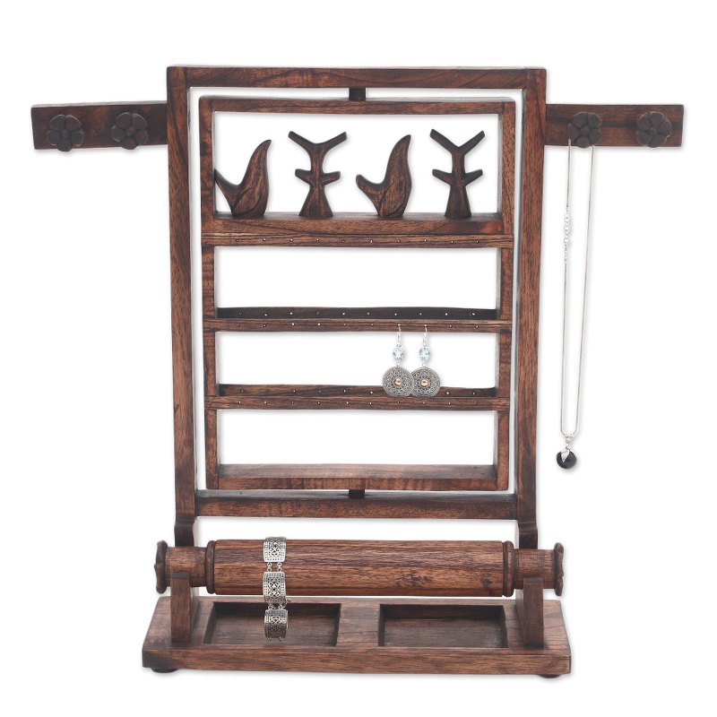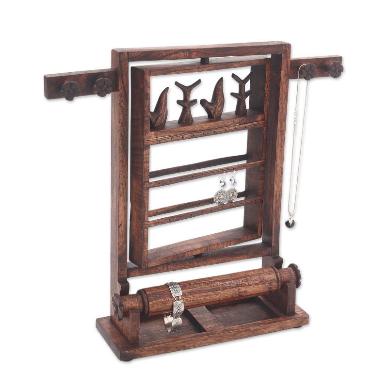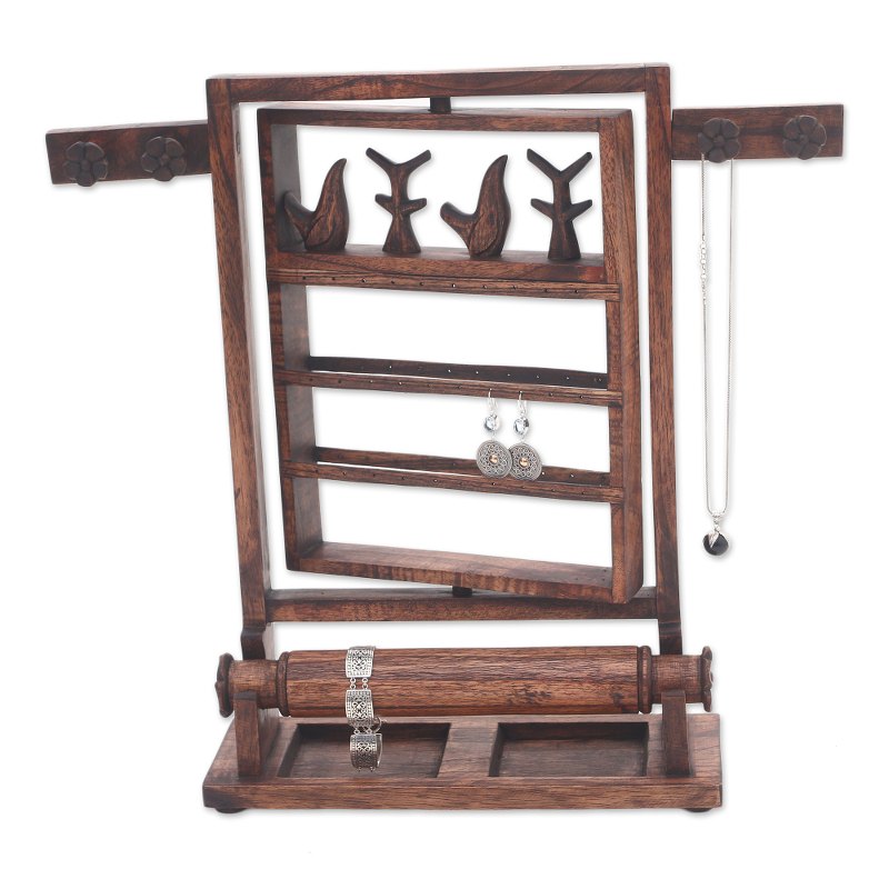 Crafted by hand from jempinis wood with a dark brown finish, this beautiful and intricate jewelry stand is offered by Bali's Komang Sulaksana. He diligently carves each fine piece by hand to offer a variety of ways to store and display your jewelry. Two bars at the top features floral posts for holding necklaces and chains. The stand's outer frame is centered by a rotating center panel, complete with hand-carved ring stands and three bars for holding earrings. A removable bracelet bar with floral ends is featured at the bottom, just above two small trays for other items.