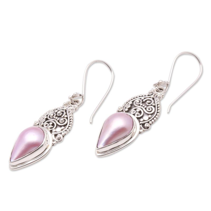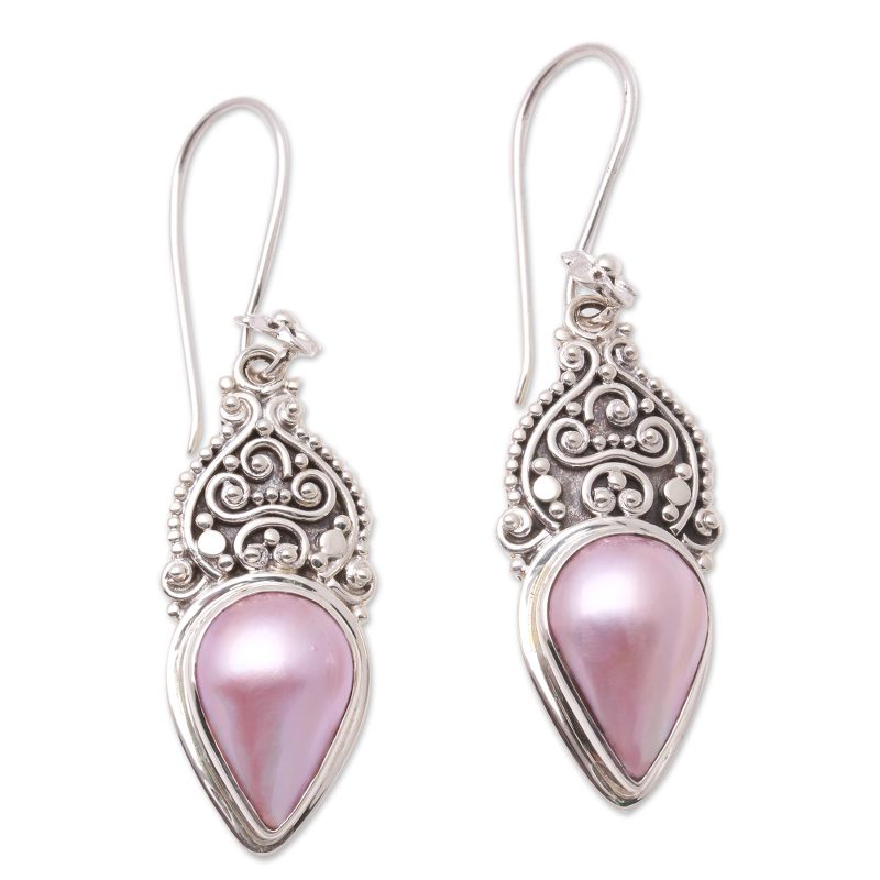 Like ripe fruit, two cultured mabe pearls glow with pink hues. Designed by Buana, these dangle earrings from Bali are handcrafted with elegant wire and dot work in sterling silver and treated with a combination of finishes. Each earring swings from a floral hook.