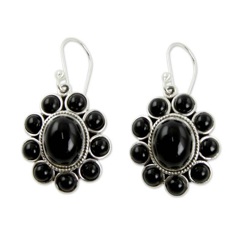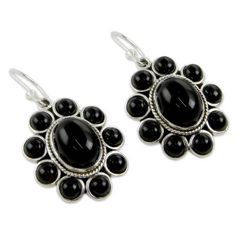 Reinterpreting India's traditional jewelry, Neeru Goel designs stunning earrings for today's fashions. Polished onyx cabochons grace sterling silver settings.
