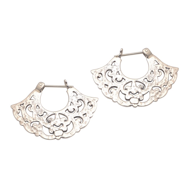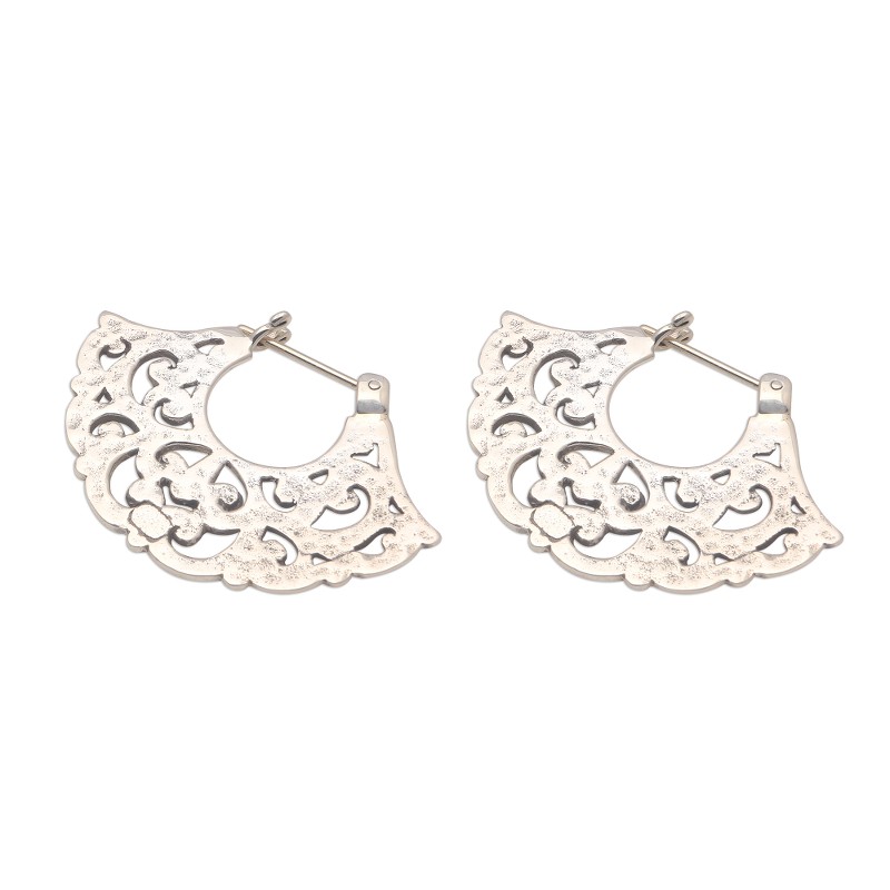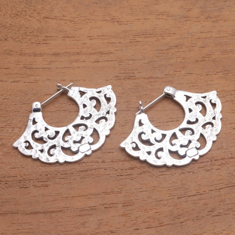 Frilly and feminine, these hoop earrings from Bali are crafted from sterling silver in fan shapes. Balinese artisan Nyoman Rena creates these earrings, which are decorated with intricate openwork.