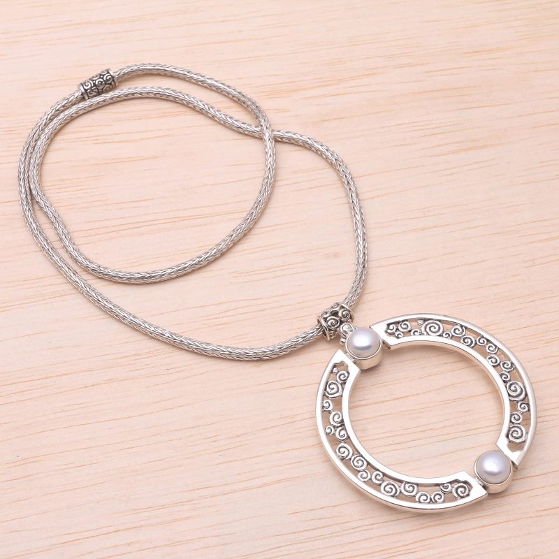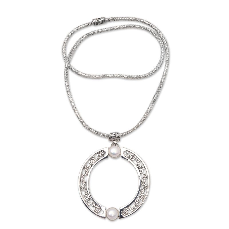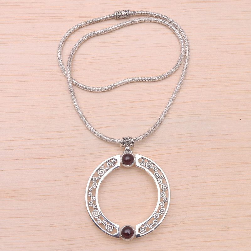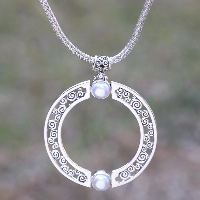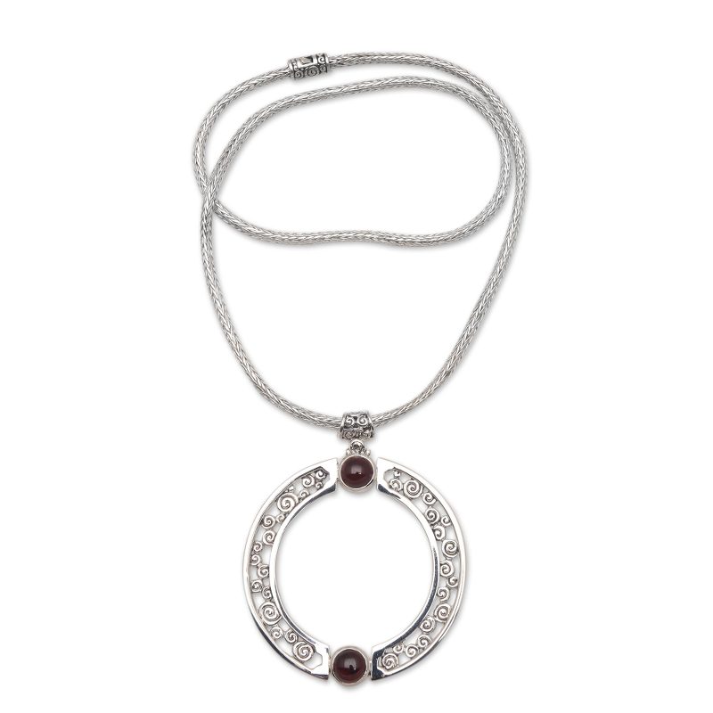 Designed by Zayd Makarim in Bali, this pendant necklace showcases two faces. A ring pendant is crafted from sterling silver, detailed with openwork "Buddha's curl" motifs that are crafted in the artisan's characteristic style. One side of the pendant displays two cabochons of natural garnet, while the other features glowing white cultured pearls.