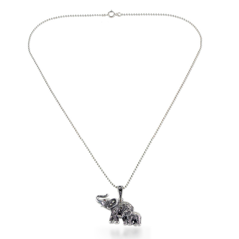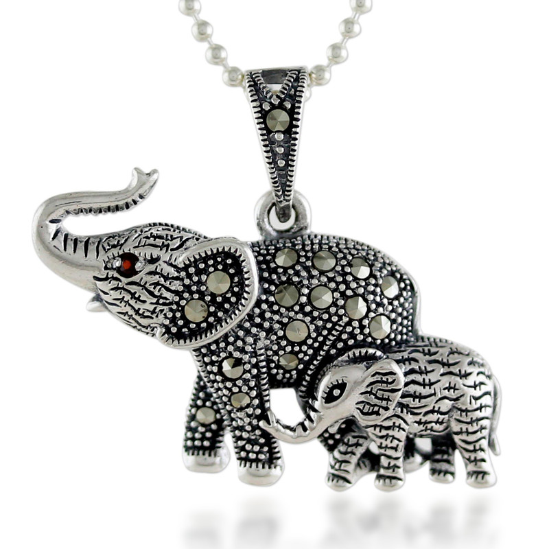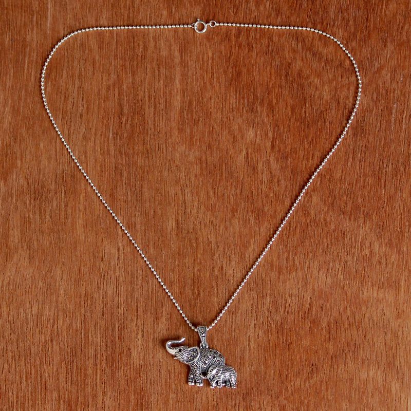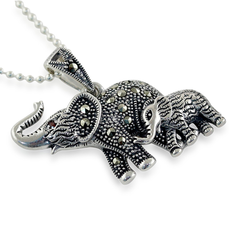 This sterling silver necklace by Thai artisan Narineespeaks to the bond between mother and child. With glittering marcasite decorating their bodies and garnets for eyes this pair makes a touching gift, and the mother elephant's upraised trunk is a sign of good luck.