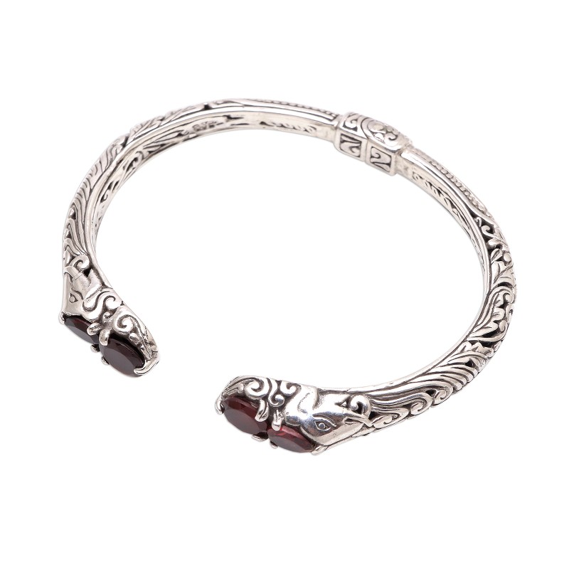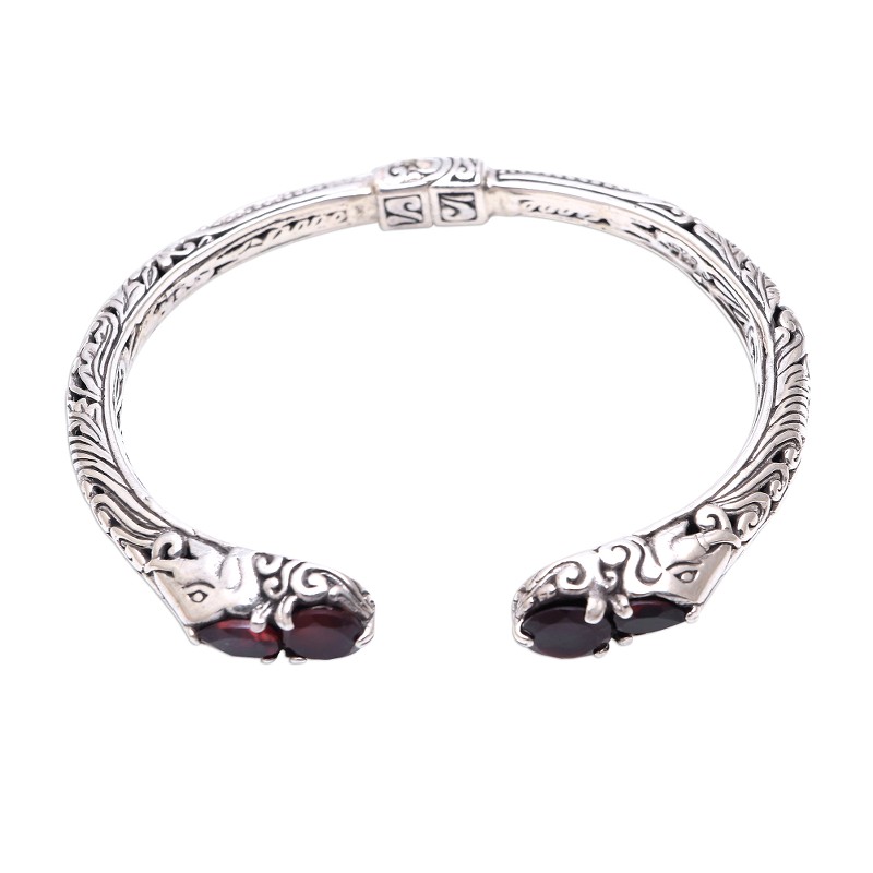Artisan Giri Tasmana of Bali handcrafts a sterling silver cuff bracelet that showcases the fiery red glow of garnets. Each end of the cuff features an elephant head beneath a pair of faceted garnet gemstones, one round and one pear-shaped. Scrolling motifs cover the cuff, which has a concealed hinge to make it easy to fit the bracelet over your wrist.