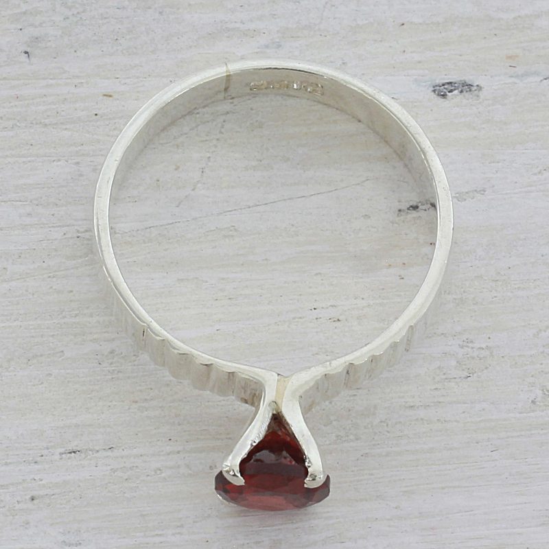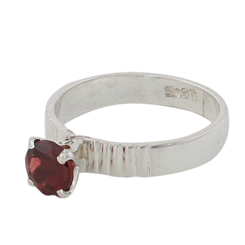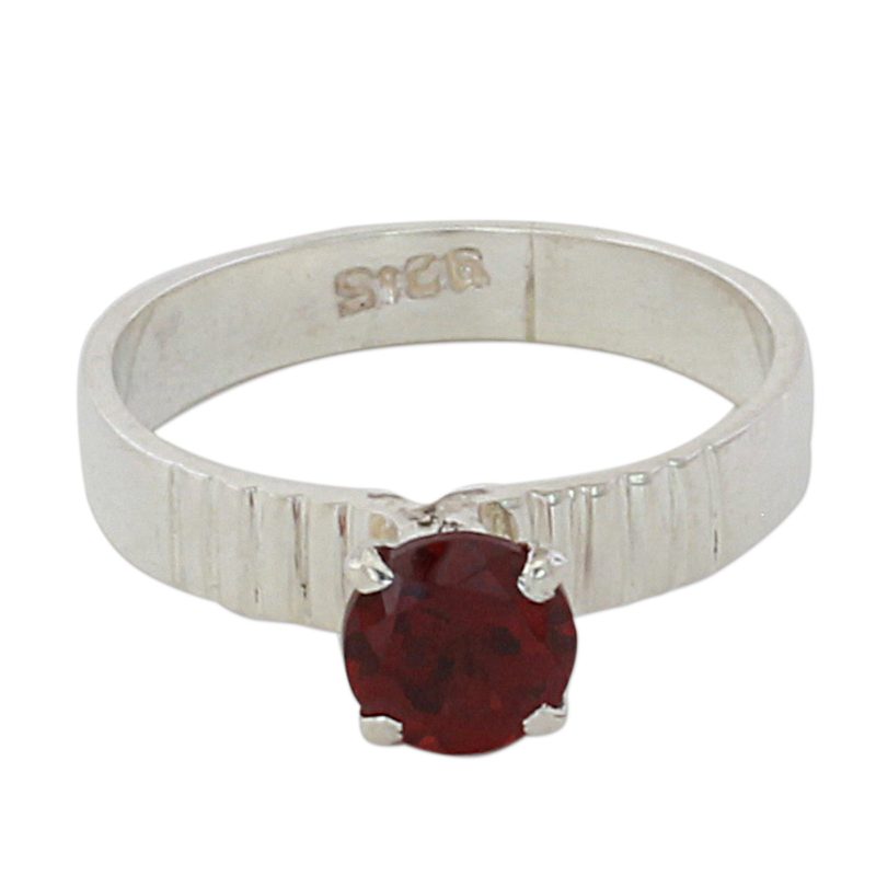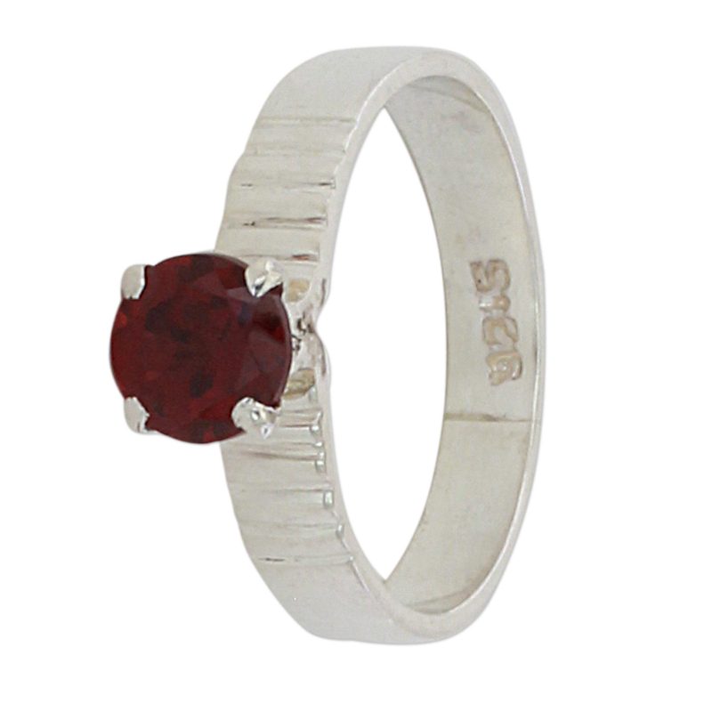 Working with local artisans, India's Alok Jain presents this ring, featuring a band that is handcrafted from sterling silver with a high-polish finish. The solitaire ring is topped with an elegant stone of faceted garnet.