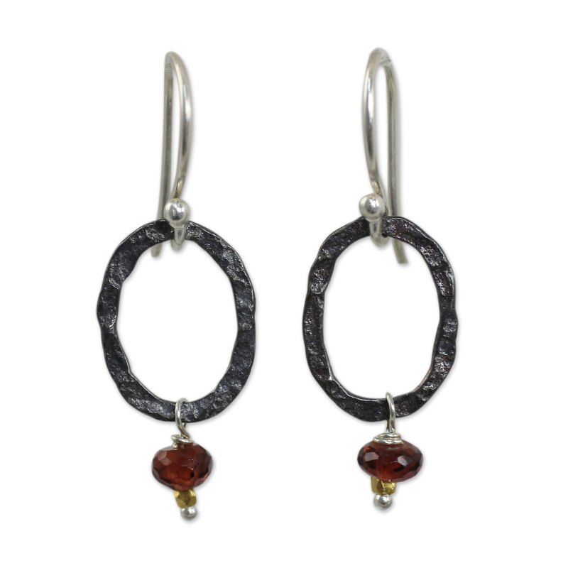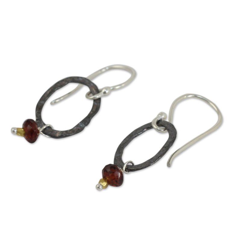 Looking like something hand-wrought in a blacksmith's forge, oxidized and hammered sterling silver ovals provide the framework for these earrings from Thailand's Khun Boom. The earrings feature rondelles of faceted garnet, considered to be a stone of passion. Tiny 24k gold plated silver beads add intriguing contrast.