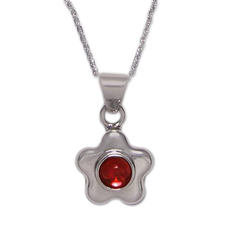 Garnet centers a silver daisy in a necklace by Alon Diller. The florid pendant is crafted by hand featuring a gleaming polished finish.