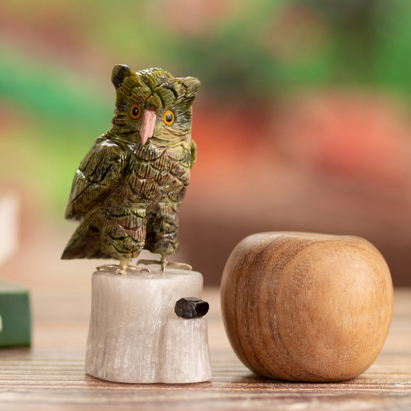 Displaying the green hues of natural serpentine, a verdant owl adds to your home decor with this gemstone sculpture from Peru. Cesar Gonzales draws inspiration from nature to create this striking sculpture. The owl is accented with a beak of rose quartz, and he stands with copper feet atop a rose quartz log with a black onyx accent.