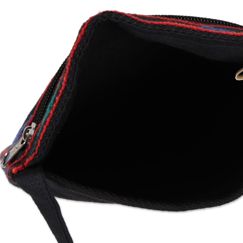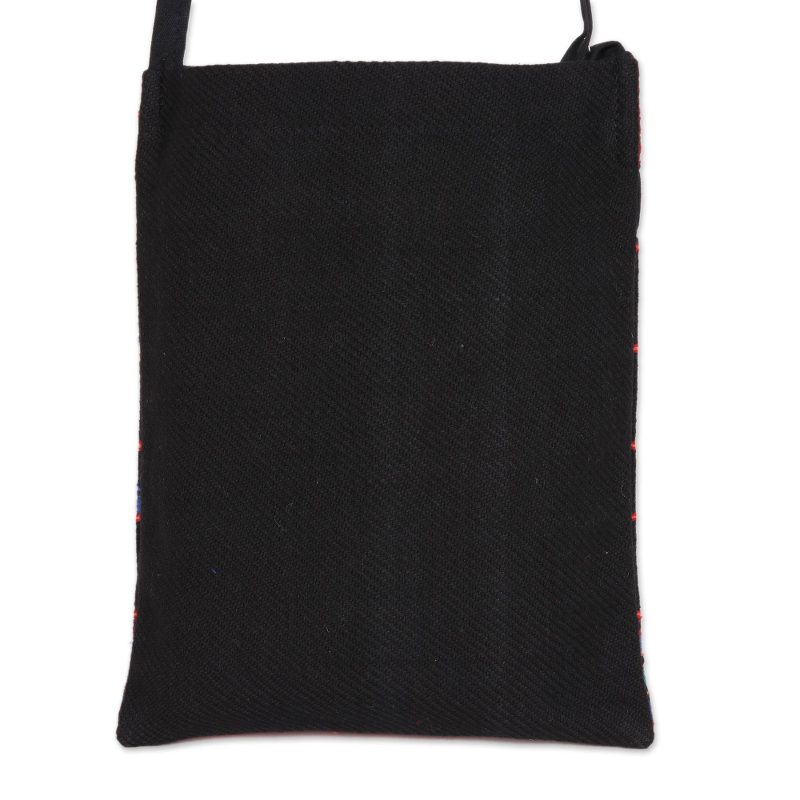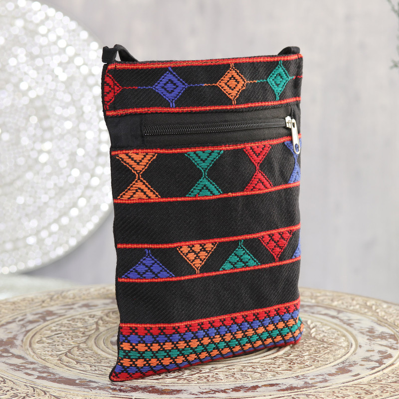 Against a background of stark black, colorful stripes and geometric patterns are diligently incorporated into the body of this sling bag. UMBVS Desert Weavers of India present this easy going bag as part of an effort to promote the welfare of local artisans in the Thar desert of Rajasthan. They weave the bag by hand from cotton on a traditional loom adding geometric patterns in bright colors using a traditional extra weft technique giving it an embroidered look. A zipper pocket on the front offers additional space for storing small items.