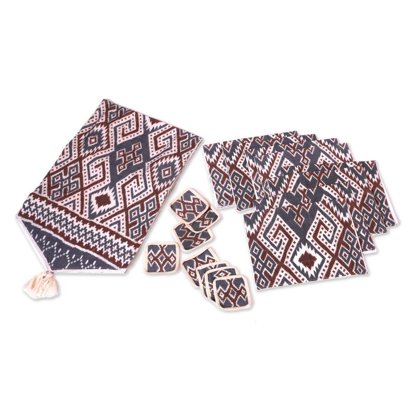 In hues of slate, chestnut, and eggshell, geometric patterns create an intricate maze in this stunning table linen set from Java. Hari Ratih designs this set, which is crafted using the ikat technique--cotton threads are tie-dyed with the predetermined pattern before being woven by hand. This set includes a table runner, eight placemats, and eight coasters with a cotton and polyester blend trim.