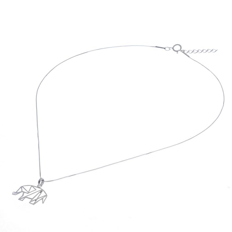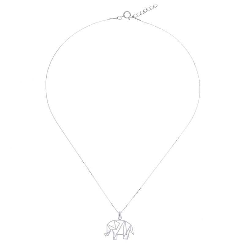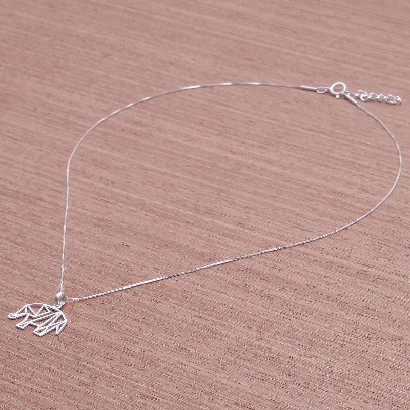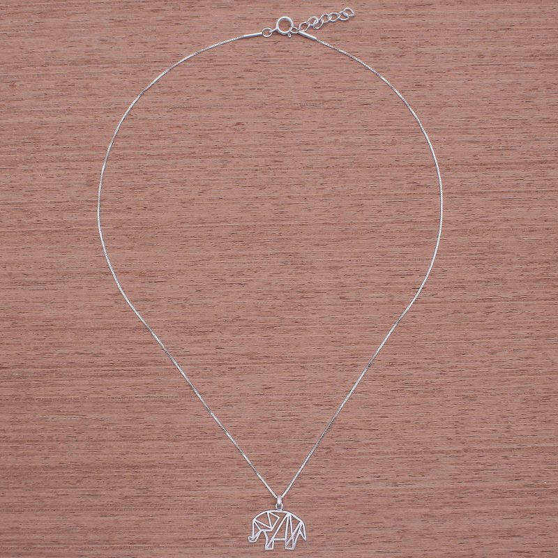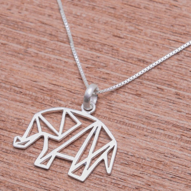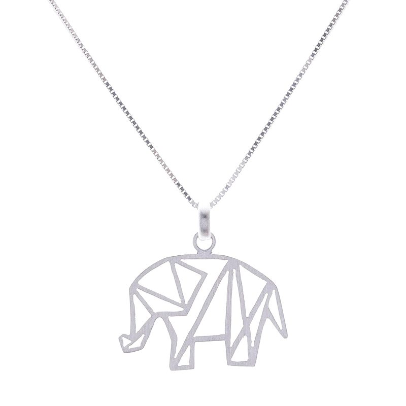 Depicted in geometric shapes, a lovely elephant is crafted from sterling silver, which is treated with a brushed-satin finish that gleams in the light. Thai artisan Jantana creates this necklace. Sterling box chain circles the neck.