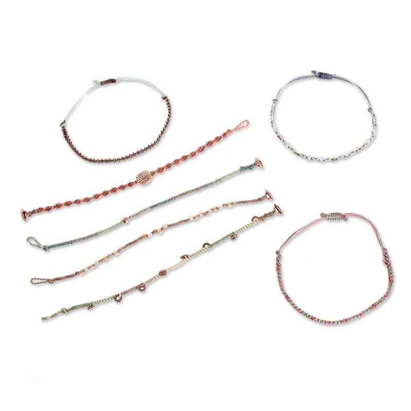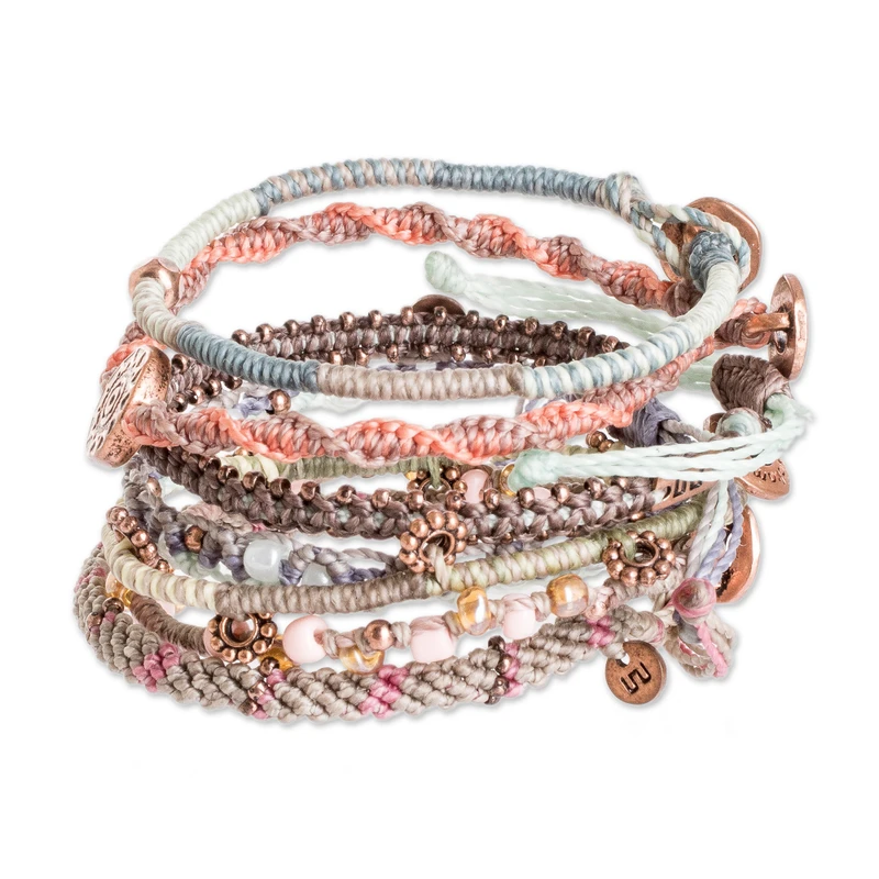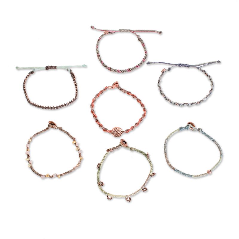 Delivery EstimateIn pastel hues, nylon cord is used to hand-macrame seven bracelets with a bohemian style. Promoting rural artisans in Guatemala, Wakami presents this set of bracelets, each of which features a unique design. Some close with metal buttons and others feature adjustable sliding knots. According to Wakami, these bracelets represent the history of Guatemala; the creation of the sun, the stars, water, air, plants, animals, as well as children are each signified by a different bracelet.