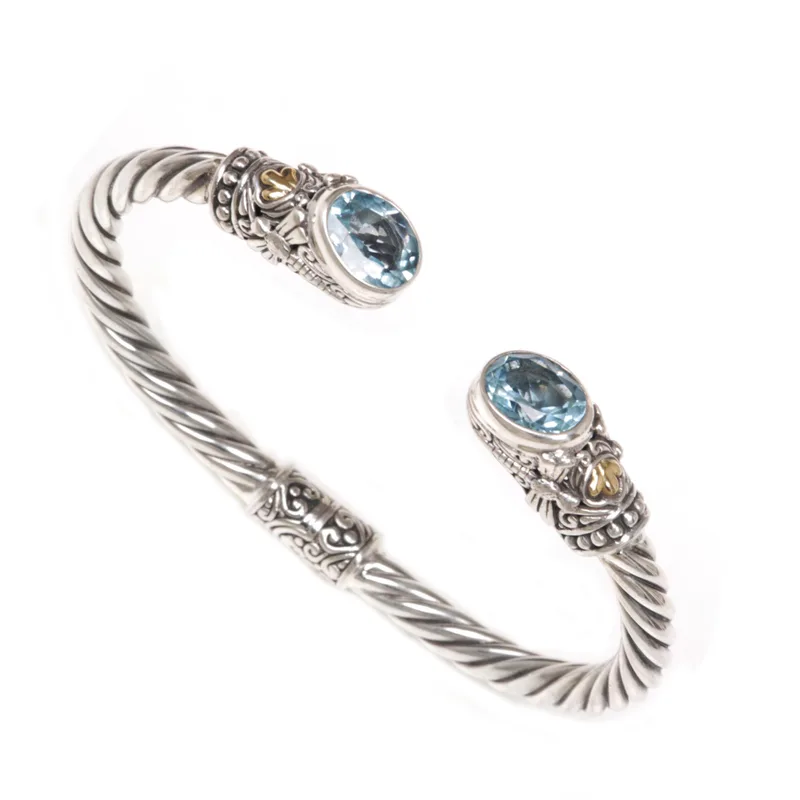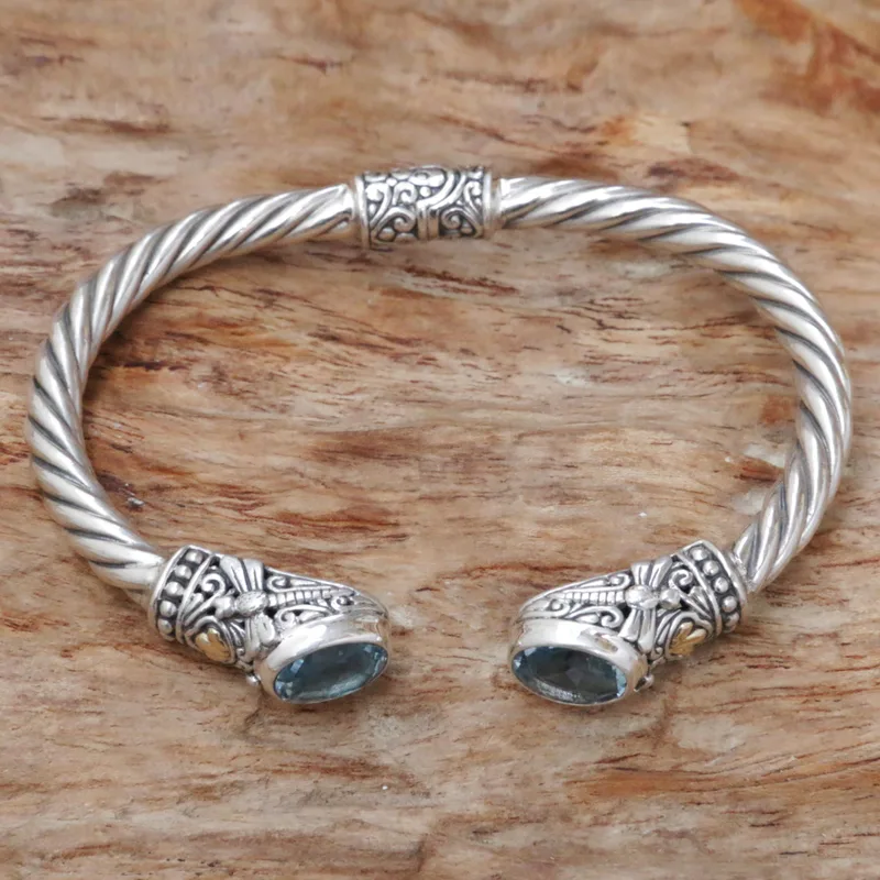 Coming from a family of farmers, Indonesian artisan Wayan Neri strikes out on her own, working with fellow craftspeople to create beautiful pieces of jewelry. She is proud to present her own designs in this cuff bracelet, which is handcrafted from sterling silver with 18k gold plated accents and dragonfly motifs. Two stones of blue topaz totaling five carats are featured on the ends for a truly beautiful design.