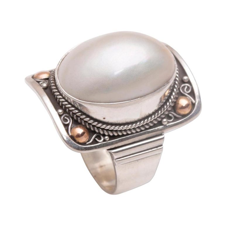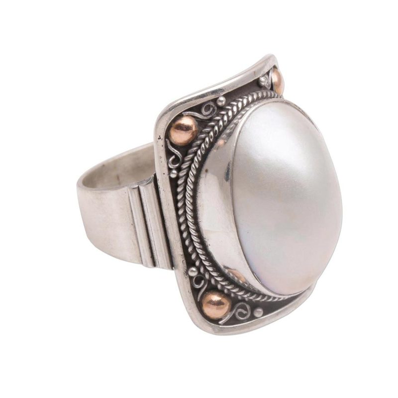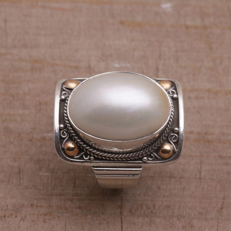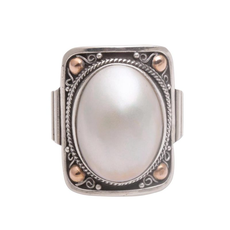 A cultured mabe pearl gleams with the moonlit hues of midnight at the top of this dome ring from Bali. Handcrafted of sterling silver, the ring features a rectangular crown with rope, spiral, and dot motifs. 18k gold accents decorate the crown at each corner.