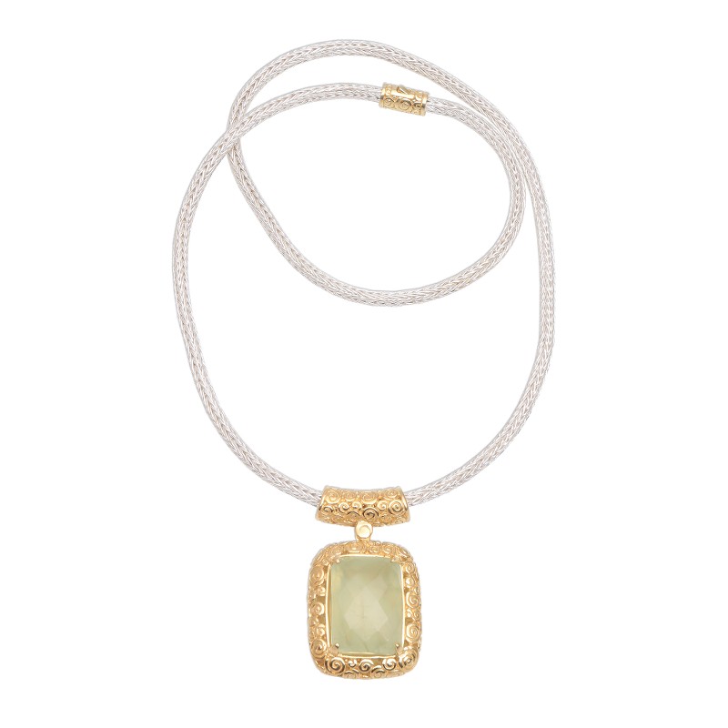Delicately detailed with intricate "Buddha's curl" motifs, this 18k gold plated sterling silver pendant features a rectangular bezel. Designed with a characteristic style by Zayd Makarim, this memorable accessory features a 15-carat prehnite stone. This necklace adorns the wearer on sterling naga chain.