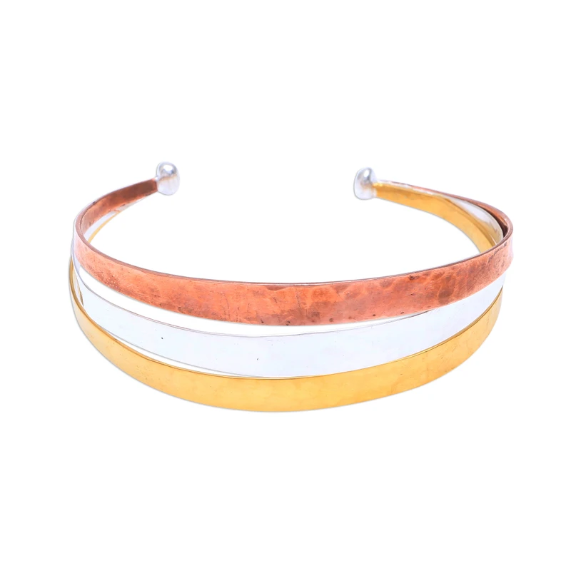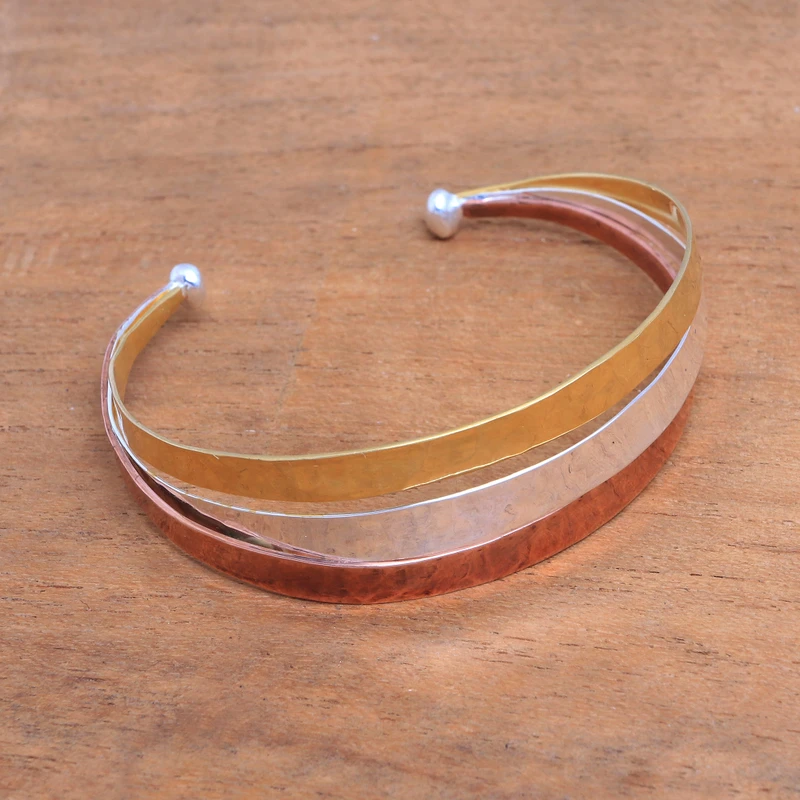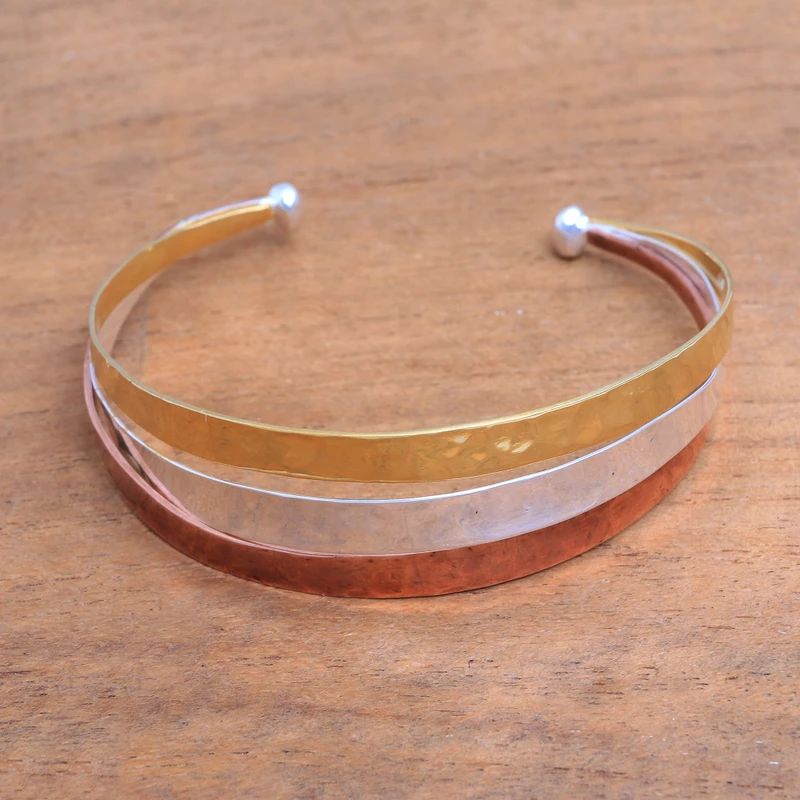 Resembling a metallic rainbow, this modern cuff bracelet from Bali is the work of Nyoman Nartawan. The stunning cuff is handcrafted with a central band of sterling silver, flanked by 22k gold and 18k rose gold for contrast.