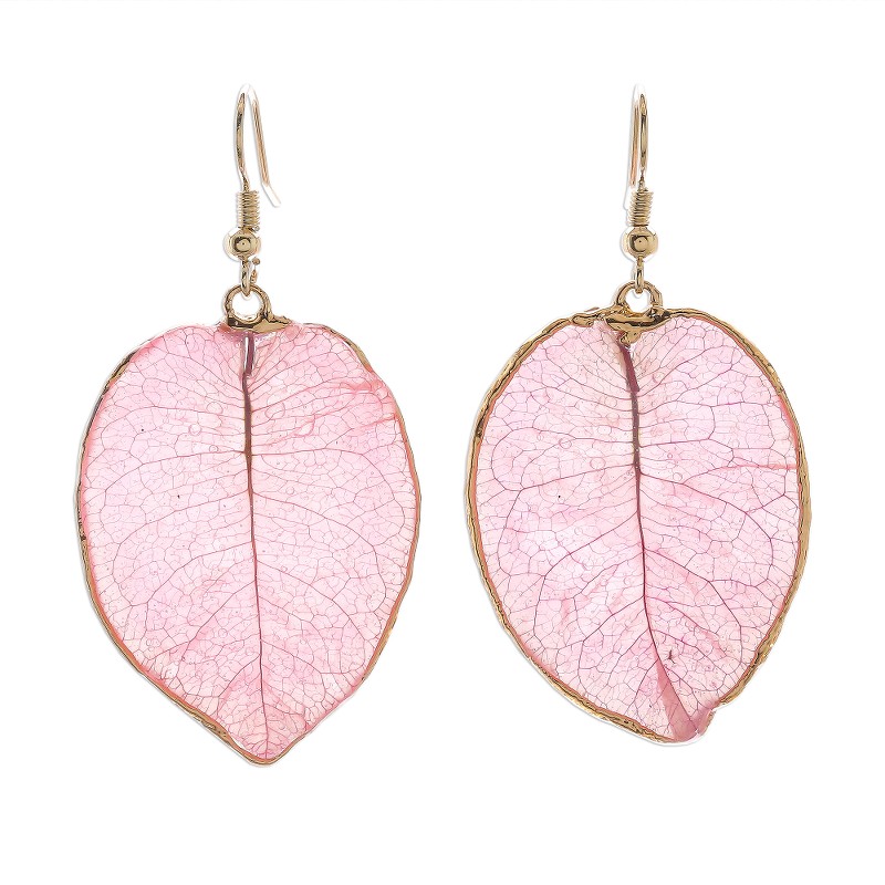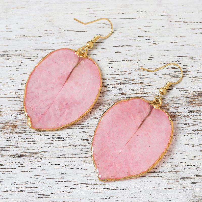 Showcasing a soft pink hue, two petals from the lovely bougainvillea flower are framed in 22k gold. Danai presents this nature-inspired pair of dangle earrings from Thailand. Swinging from a hook of 22k gold plated brass, each petal is encased in gleaming resin to preserve its beauty.