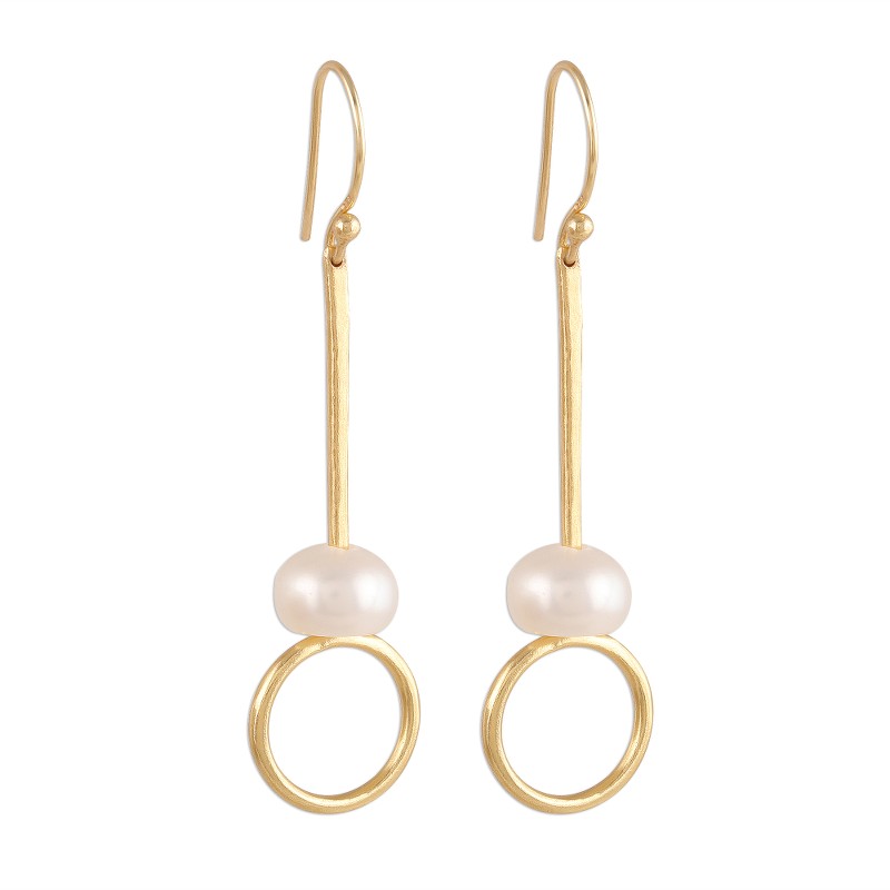 Resting above rings of sterling silver bathed in 22k gold, two cultured pearls glow beautifully. Vivek Nathany from India designs these fantastic dangle earrings.